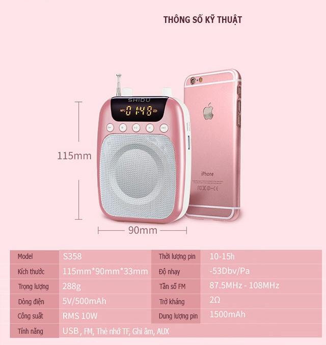 • Có thể kết nối Bluetooth với điện thoại, laptop, máy nghe nhạc....Có chức năng FM hỗ trợ tần số 87.5 đên 108 Mhz (hỗ trợ các đài FM ở Việt Nam : VOV giao thông, VOV1, VOV2, VOV). Có khe cắm USB, khe thẻ TF giúp bạn phát âm thanh, nghe nhạc trực tiếp từ USB, thẻ nhớ (Hỗ trơ thẻ 16GB)Shidu S358 tích hợp pin Lithium 1500mAh, cho phép bạn sử dụng liên tục 15h liên tục (~ 1,5 ngày giảng bài của giáo viên). Công suất loa 10W (2.1 kênh). Shidu S358 phù hợp cho phòng diện tích ~ 50 mét vuông.