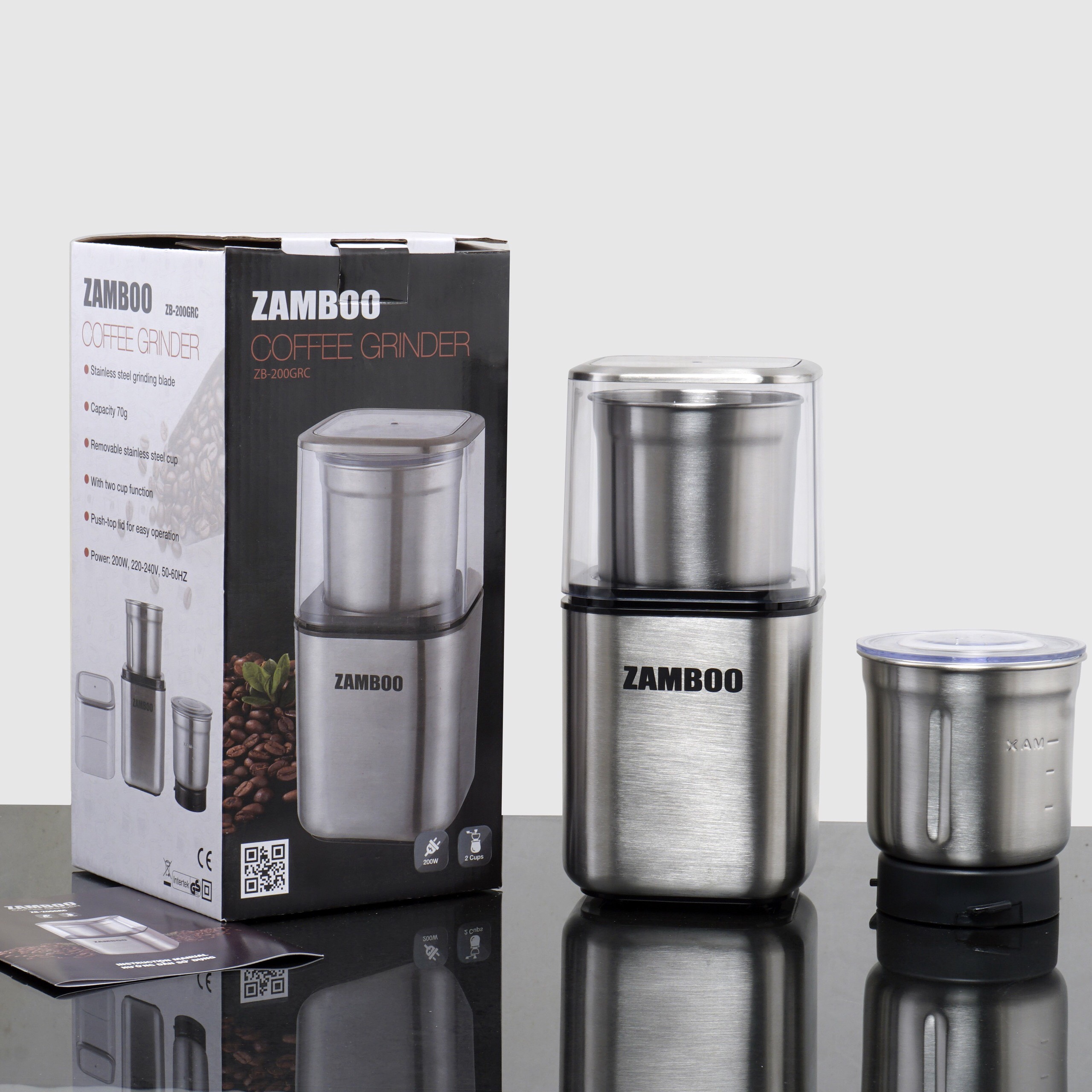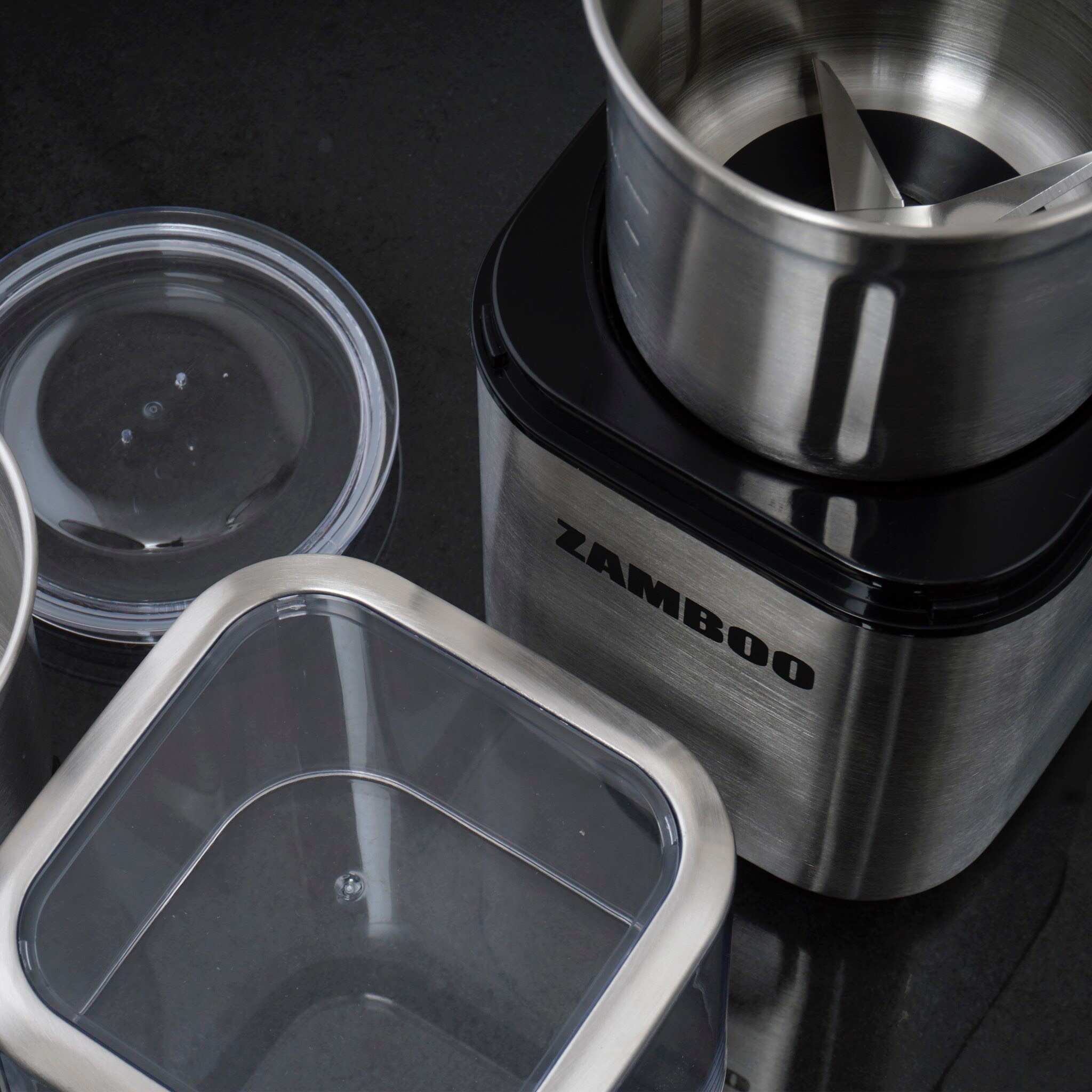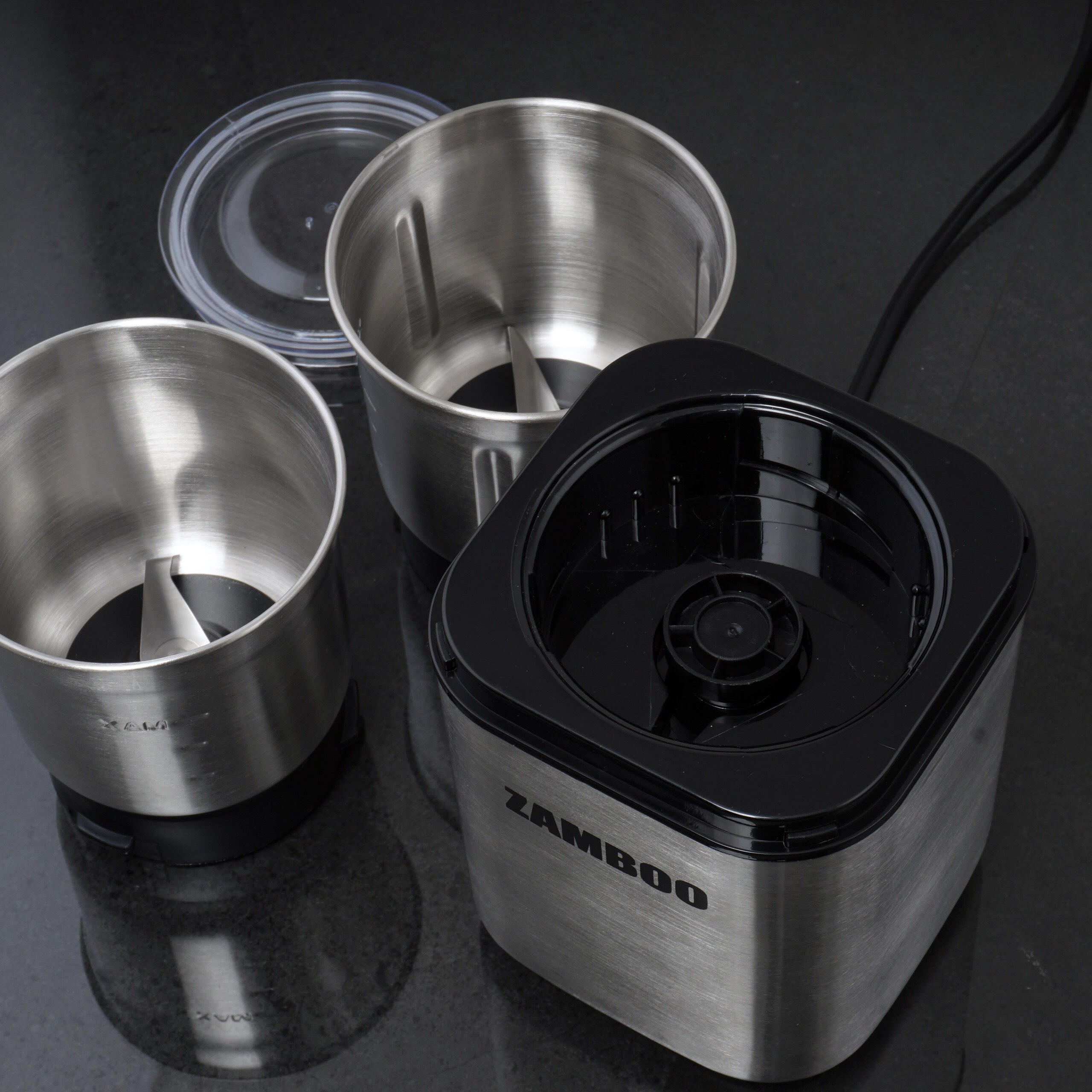 -Máy xay 2 chức năng Zamboo là vật dụng dùng trong nhà bếp, thiết kế cho các chức năng xay đồ khô và xay đồ ướt, với 2 cốc xay bằng inox có thể tháo rời để thay thế. Cối xay khô thiết kế 1 lưỡi dao đôi, dùng xay các loại hạt khô, gia vị khô như cà phê, tiêu, đậu, gạo rang, hay các loại hạt ngũ cố Cối xay ướt thiết kê 2 lưỡi dao đôi, dùng xay đồ có nước như gừng, tỏi, ớt, nghệ