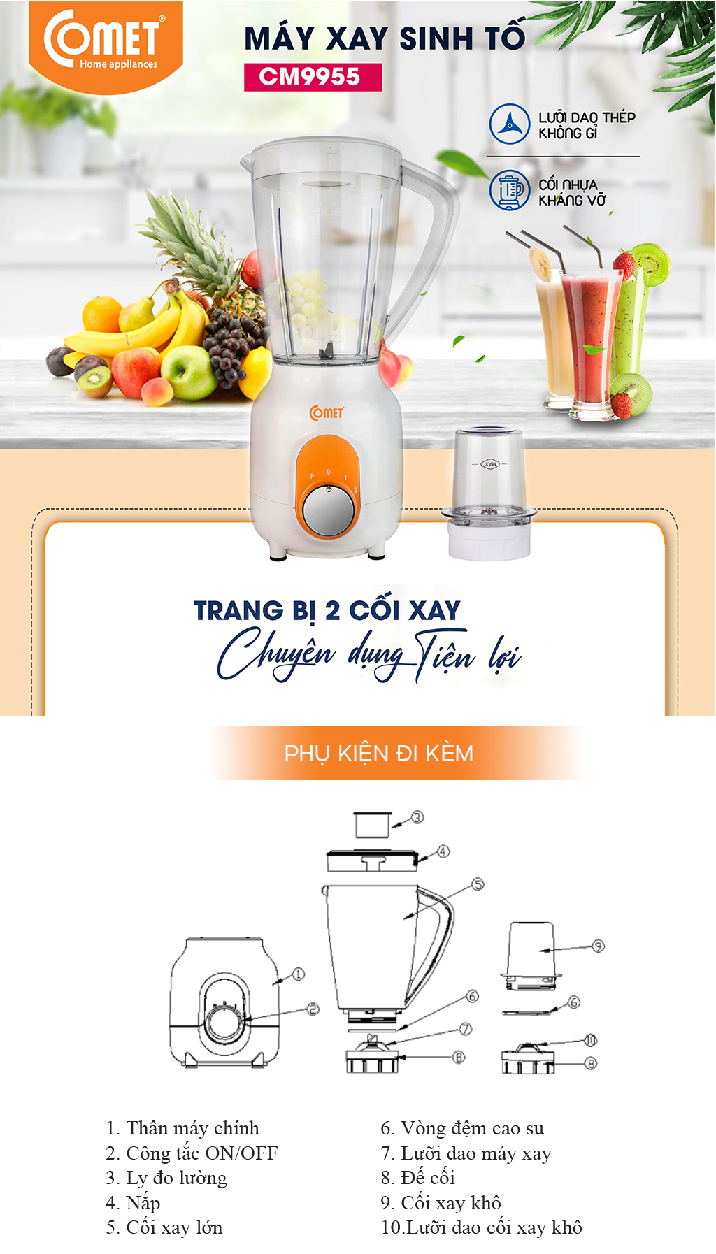 - Máy xay sinh tố Comet CM9955 có kiểu dáng hiện đại, màu sắc trẻ trung, giúp căn bếp trở nên tươi mới hơn bao giờ hết. Công suất mạnh mẽ -