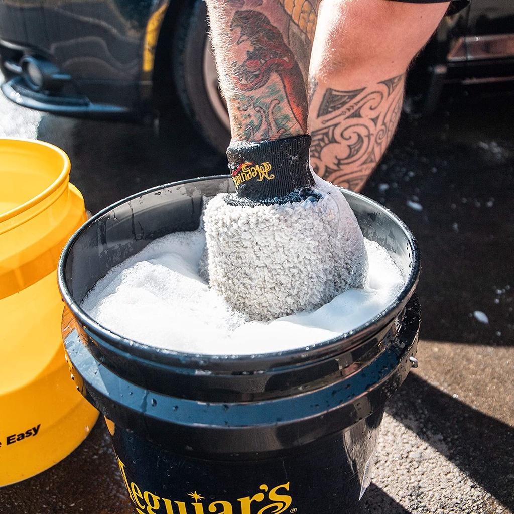 • Pha xà phòng với nước sạch theo tỷ lệ 1:128, kết hợp với găng tay rửa xe chuyên dụng ( tốt nhất nên sử dụng Găng tay rửa xe Meguiar's Microfiber Wash Mitt - X3002 EU ) từng bước làm sạch bề mặt xe.