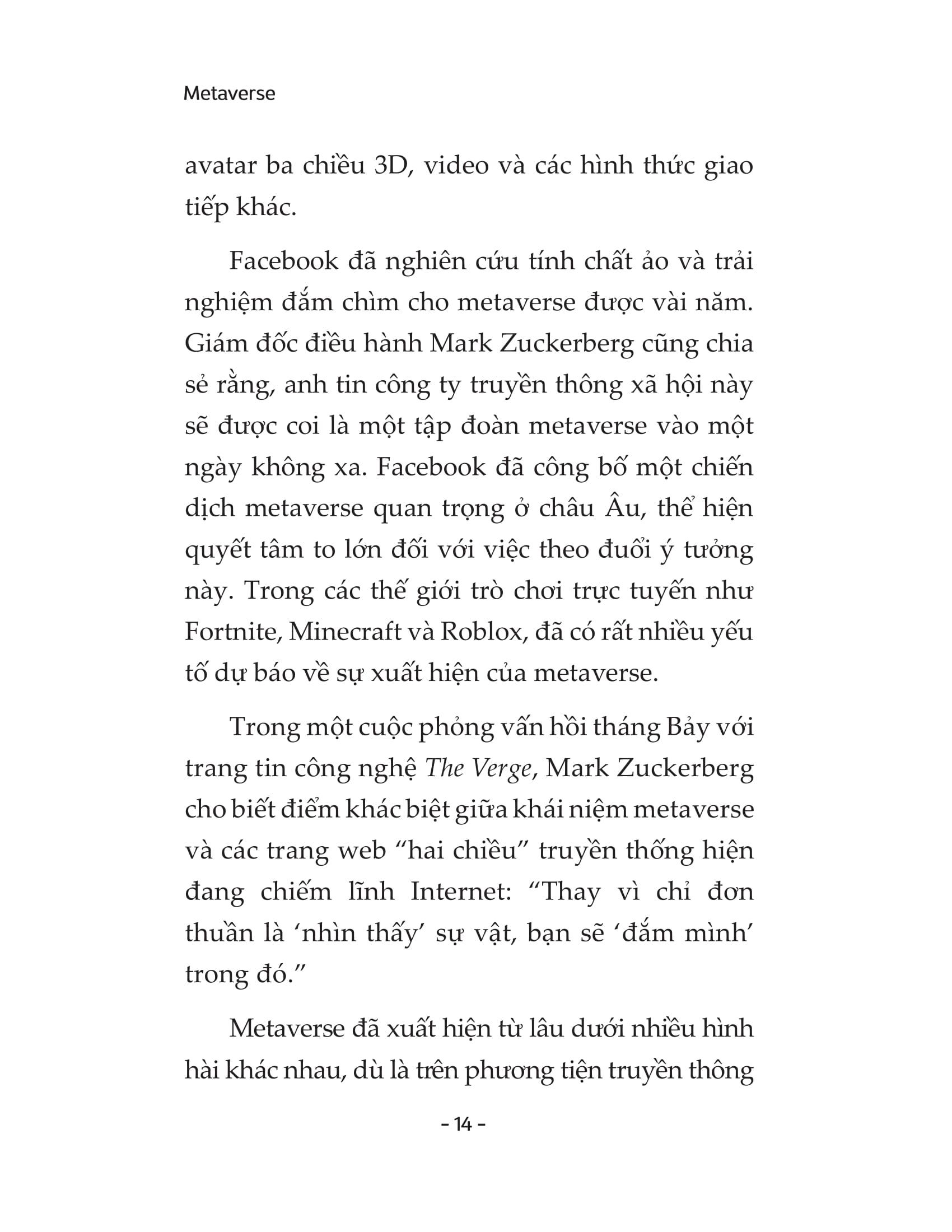 Khái niệm metaverse xuất hiện lần đầu tiên trong tiểu thuyết khoa học viễn tưởng, mô tả một xã hội trong đó các cá nhân say mê những avatar ảo, các công ty máy tính đa quốc gia nắm giữ quyền lực lớn hơn cả chính phủ và cuộc sống vật chất thì liên tục xuống cấp. Liệu chúng ta có thể duy trì thái độ bàng quan, “chuyện gì đến sẽ đến” đối với tương lai của mình nữa không, khi khoa học ngày nay đã bắt kịp với những tình tiết tưởng như chỉ có trong tiểu thuyết khoa học viễn tưởng? Cuốn sách METAVERSE đưa ra bức tranh toàn cảnh để nhấn mạnh rằng, con người không thể chỉ thụ động chờ đợi, mà cần nêu lên nhiều câu hỏi, tư duy đa góc độ và đưa ra các quyết định một cách cẩn thận, có đạo đức - nhất là khi chúng ta đang tự tay xây dựng tương lai của mình bằng cách sử dụng khoa học và công nghệ.