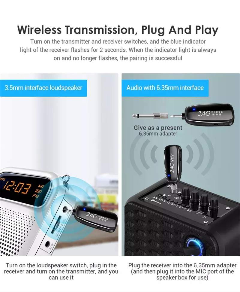 G18 2.4G Wireless Microphone Headset Mic Voice Amplifier Speaker cho Điện Thoại SmartPhone, Android, Trò Chơi Trực Tuyến, Giảng Dạy, Livestream Micro không dây G18 là giải pháp hoàn hảo cho những ai thường xuyên cần giao tiếp với khán giả, học sinh hoặc đồng nghiệp. Với thiết kế tinh tế, công nghệ 2.4G hiện đại, và thời lượng pin lên đến 10 giờ sử dụng liên tục, sản phẩm này đảm bảo hiệu suất cao trong mọi tình huống, dù là giảng dạy, thuyết trình hay sử dụng trong các sự kiện trực tiếp. Công nghệ không dây 2.4G và thiết kế nhỏ gọn Micro không dây G18 sử dụng công nghệ truyền dẫn số 2.4G, giúp tăng cường độ ổn định tín hiệu và loại bỏ tình trạng nhiễu tần số thường gặp ở các loại micro không dây khác. Nhờ khả năng kết nối dài lên đến 50m trong môi trường không có vật cản và từ 15-30m khi có vật cản, người dùng có thể di chuyển linh hoạt mà không lo về việc mất kết nối. Thiết kế nhỏ gọn, trọng lượng chỉ 81.5g giúp micro dễ dàng đeo trên tai mà không gây khó chịu khi sử dụng trong thời gian dài. Sản phẩm còn đi kèm với bộ thu nhận tín hiệu và các phụ kiện như jack 3.5mm, 6.5mm giúp kết nối được với hầu hết các thiết bị âm thanh như loa, máy tính, laptop, và các hệ thống âm thanh chuyên nghiệp khác. Tích hợp nút điều chỉnh âm lượng và sạc pin tiện lợi Trên thân micro G18, nhà sản xuất đã tích hợp sẵn nút điều chỉnh âm lượng, cho phép người dùng dễ dàng kiểm soát cường độ âm thanh một cách trực tiếp, đảm bảo rằng âm thanh phát ra luôn được điều chỉnh phù hợp với không gian và yêu cầu cụ thể của người dùng. Micro được trang bị pin sạc Lithium-Ion với dung lượng 400mAh, cho phép thời gian sử dụng liên tục từ 6 đến 10 giờ. Sản phẩm cũng hỗ trợ sạc qua cổng USB từ nhiều nguồn khác nhau như máy tính, laptop, sạc dự phòng, hay điện thoại di động, giúp bạn thoải mái sử dụng mà không lo ngại về thời gian sạc hay hết pin giữa chừng. Âm thanh chất lượng cao, chống nhiễu hiệu quả Một trong những điểm nổi bật của micro không dây G18 là chất lượng âm thanh xuất sắc. Với công nghệ mã hóa số tiên tiến, micro này có khả năng tái tạo âm thanh rõ ràng, trung thực và không bị rè, hú. Điều này giúp người sử dụng, đặc biệt là các giáo viên, hướng dẫn viên, hay người dẫn chương trình, có thể truyền tải thông điệp một cách hiệu quả mà vẫn giữ được giọng nói khỏe mạnh sau thời gian dài sử dụng. Công nghệ chống nhiễu tiên tiến cũng được tích hợp vào sản phẩm, giúp hạn chế tối đa hiện tượng nhiễu âm từ môi trường xung quanh. Điều này đảm bảo rằng âm thanh thu được luôn rõ ràng và không bị gián đoạn, kể cả khi bạn đang làm việc trong các môi trường có nhiều thiết bị điện tử khác. Kết nối đa dạng, phù hợp với nhiều thiết bị Micro không dây G18 được trang bị các đầu cắm đa dạng như jack 3.5mm và adapter 6.5mm, cho phép kết nối dễ dàng với các thiết bị âm thanh phổ biến như loa, mixer, máy tính, hoặc các hệ thống âm thanh trên xe hơi. Sản phẩm hỗ trợ tốt trên nhiều hệ điều hành, bao gồm Windows, và Android, giúp người dùng có thể linh hoạt sử dụng trong nhiều trường hợp khác nhau. Một điểm cần lưu ý là micro này không hỗ trợ kết nối Bluetooth với loa, mà người dùng cần cắm trực tiếp vào jack mic trên thiết bị âm thanh. Đây là thiết kế giúp tăng cường độ ổn định tín hiệu và đảm bảo âm thanh không bị gián đoạn trong quá trình sử dụng. Thời gian sạc và pin bền bỉ Micro G18 sử dụng pin Lithium-Ion cao cấp, cho thời gian sạc đầy trong khoảng 4 giờ, sau đó có thể hoạt động liên tục trong 6-10 giờ tùy thuộc vào cường độ sử dụng. Điều này giúp người dùng thoải mái sử dụng micro trong suốt cả ngày dài mà không lo bị gián đoạn. Đặc biệt, việc sạc pin qua cổng USB giúp người dùng linh hoạt sạc pin mọi lúc mọi nơi, chỉ cần có cổng USB là bạn đã có thể sạc pin cho thiết bị của mình. Lưu ý khi sử dụng micro G18