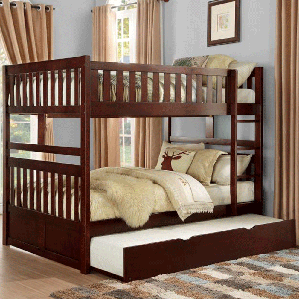 Giường tầng xuất khẩu Leeds 1m4 có kích thước lọt lòng giường trên/dưới là 140x193 cm, phủ bì 205x146x163 cm. Khoảng cách giữa 2 tầng là 90 cm, cầu thang bố trí bên phải. Chân trụ dày 35x65 mm chịu lực. Thang giường được làm từ gỗ Plywood chắc chắn, dẻo dai với 13 thanh (cung sinh) bắt vít. Đặc biệt, các tầng được thiết kế tháo rời và có thể tách riêng thành 2 giường độc lập. Tùy nhu cầu, Quý khách có thể chọn loại chỉ giường để gầm thông thoáng, thêm ngăn kéo để đồ hay thêm giường kéo tăng chỗ ngủ. Kích thước DxRxC cả 2 hộc kéo là 95x11x40 cm, giường kéo là 100x185 cm. Ngoài loại 1m4, giường tầng Leeds còn có  với các màu mật ong, nâu và trắng. Giường tầng không chỉ giúp tiết kiệm không gian, mà còn là thế giới riêng của các bé. Giường tầng Leeds được thiết kế tối giản với thang liền, 2 tầng có kích thước bằng nhau. Khoảng cách giữa 2 tầng rộng rãi không sợ đụng đầu, kể cả với người lớn. Chất liệu gỗ thông xẻ sấy nhập khẩu được gia công tỉ mỉ, kết cấu chắc chắn, giúp các bé vui chơi an toàn và có những giấc ngủ ngon.