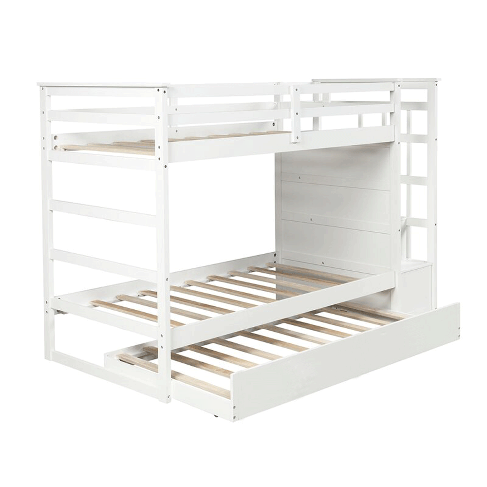 Giường tầng thang hộp XK Newport 1m/1m có kích thước lọt lòng giường trên/dưới là 100x193 cm, phủ bì 251x110x160 cm. Khoảng cách giữa 2 tầng là 97 cm, cầu thang hộp rộng 46cm bố trí bên phải với các hộc kéo mở bên hông. Chân trụ dày 30x50 mm chịu lực. Thang giường được làm từ gỗ Plywood chắc chắn, dẻo dai với 13 thanh (cung sinh) bắt vít. Đặc biệt, các tầng được thiết kế tháo rời và có thể tách riêng thành 2 giường độc lập. Tùy nhu cầu, Quý khách có thể chọn loại chỉ giường để gầm thông thoáng, thêm ngăn kéo để đồ hay thêm giường kéo tăng chỗ ngủ. Kích thước DxRxC cả 2 hộc kéo là 95x11x40 cm, giường kéo là 100x185 cm. Giường tầng không chỉ giúp tiết kiệm không gian, mà còn là thế giới riêng của các bé. Giường tầng Newport được thiết kế tối giản với 2 tầng có kích thước bằng nhau, thang rời tích hợp ngăn kéo đựng đồ tiện lợi. Khoảng cách giữa 2 tầng rộng rãi không sợ đụng đầu, kể cả với người lớn. Chất liệu gỗ thông xẻ sấy nhập khẩu được gia công tỉ mỉ, kết cấu chắc chắn, giúp các bé vui chơi an toàn và có những giấc ngủ ngon. Miễn phí lắp đặt tại TP.HCM, Bình Dương, Đồng Nai.