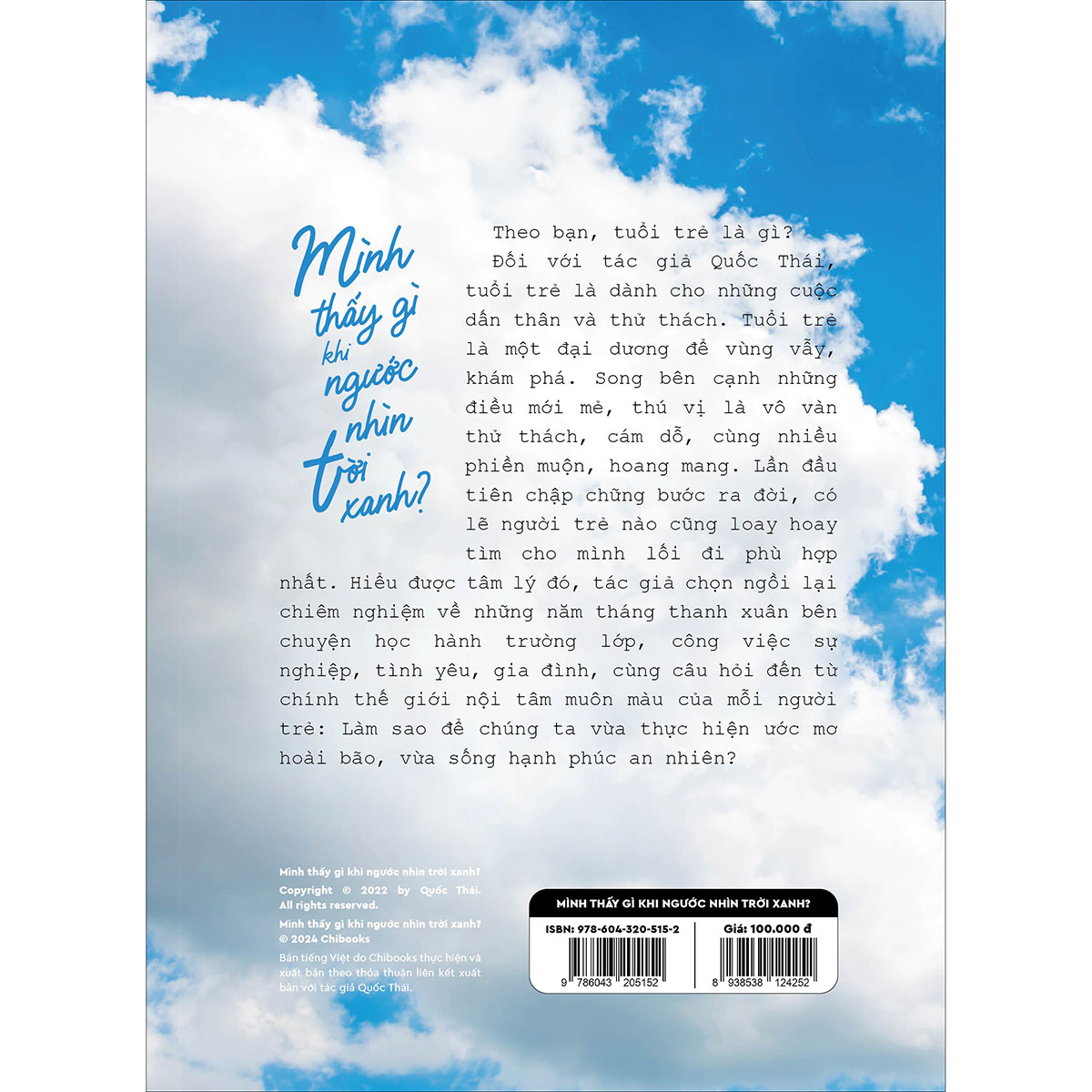 Mua tại TiktokTheo bạn, tuổi trẻ là gì? Đối với tác giả Quốc Thái, tuổi trẻ là dành cho những cuộc dấn thân và thử thách. Tuổi trẻ là một đại dương để vùng vẫy, khám phá. Song bên cạnh những điều mới mẻ, thú vị là vô vàn thử thách, cám dỗ, cùng nhiều phiền muộn, hoang mang. Lần đầu tiên chập chững bước ra đời, có lẽ người trẻ nào cũng loay hoay tìm cho mình lối đi phù hợp nhất. Hiểu được tâm lý đó, tác giả chọn ngồi lại chiêm nghiệm về những năm tháng thanh xuân bên chuyện học hành trường lớp, công việc sự nghiệp, tình yêu, gia đình, cùng câu hỏi đến từ chính thế giới nội tâm muôn màu của mỗi người trẻ: Làm sao để chúng ta vừa thực hiện ước mơ hoài bão, vừa sống hạnh phúc an nhiên?