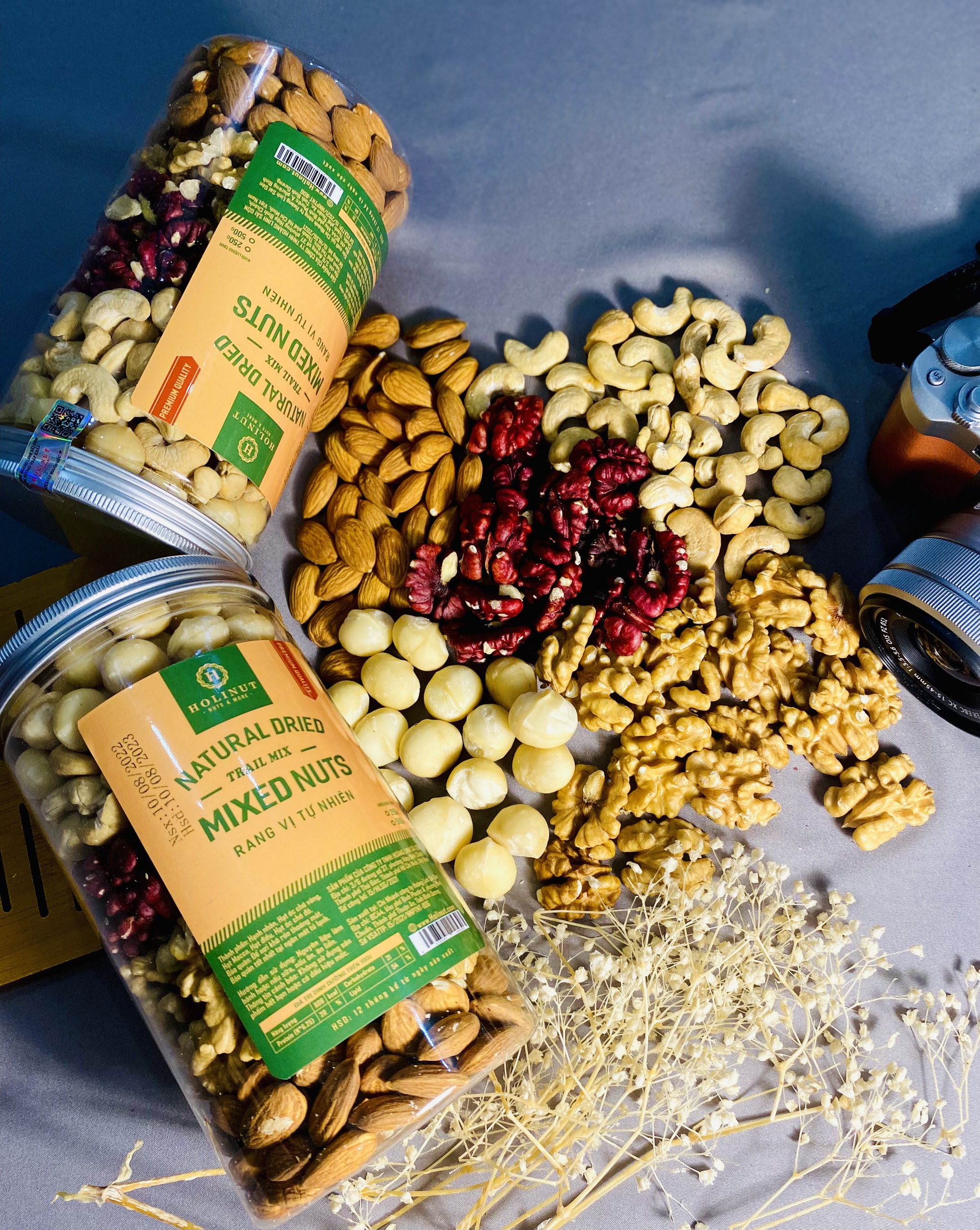 Thành phần: Nhân óc chó vàng, nhân óc chó đỏ, nhân macca, hạt hạnh nhân, hạt điều.