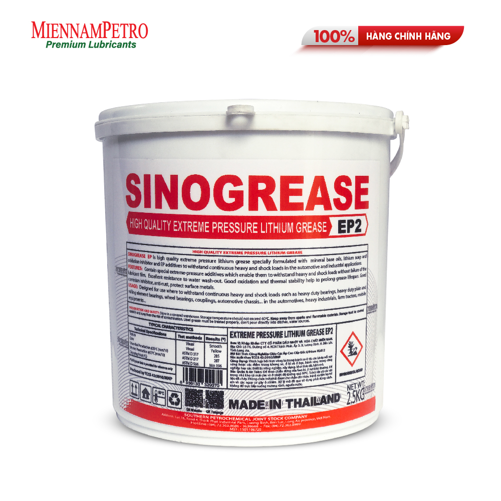 THÔNG TIN SẢN PHẨM: Mỡ bôi trơn Sinogrease High Quality Extreme Pressure Lithium Grease EP2 là mỡ bò Lithium cao cấp cùng với các hệ phụ gia cực áp đặc dụng, chống gỉ, chống oxy