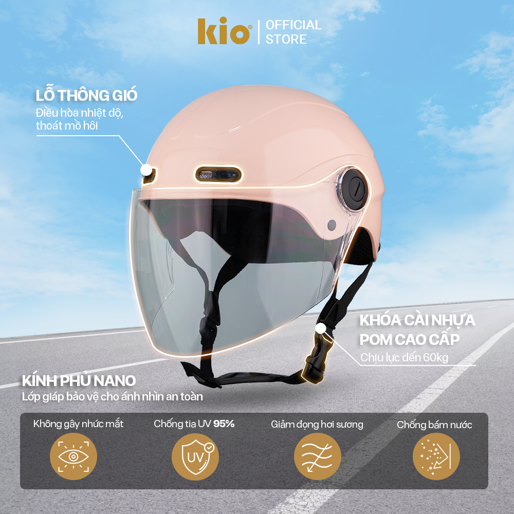 Mũ Bảo Hiểm Nửa Đầu Kio SafeStyle Go KN03K, Kính Âm Phủ Nano Chống Tia UV, Lớp Lót Kháng Khuẩn. ️An toàn & thời trang trên từng hành trình Kio SafeStyle Go không đơn thuần