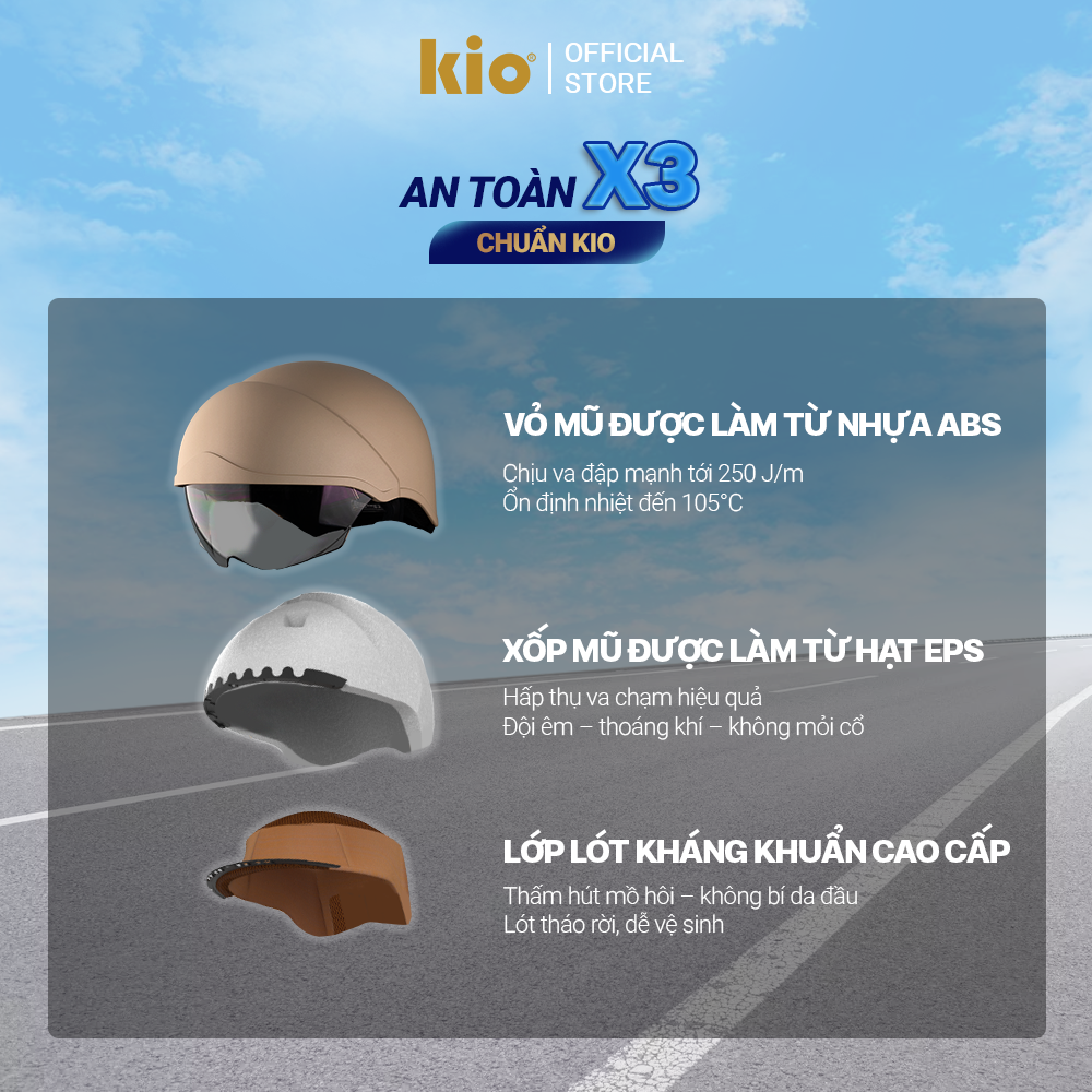 Mũ Bảo Hiểm Nửa Đầu Kio SafeStyle Go KN03K, Kính Âm Phủ Nano Chống Tia UV, Lớp Lót Kháng Khuẩn. ️An toàn & thời trang trên từng hành trình Kio SafeStyle Go không đơn thuần