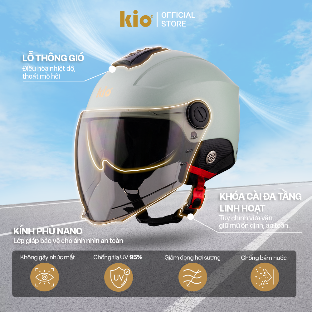 Mũ Bảo Hiểm Nửa Đầu Kio SafeStyle Go KN03K, Kính Âm Phủ Nano Chống Tia UV, Lớp Lót Kháng Khuẩn. ️An toàn & thời trang trên từng hành trình Kio SafeStyle Go không đơn thuần