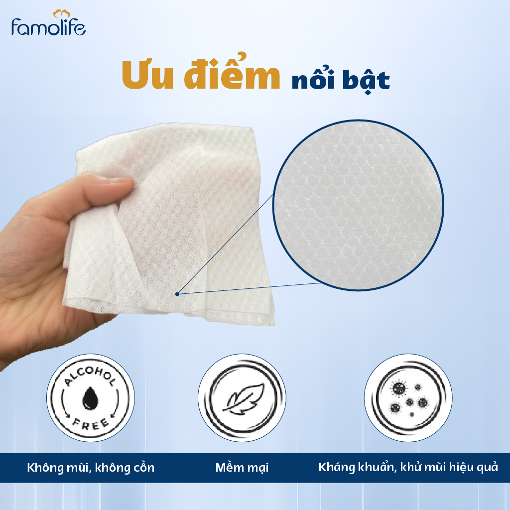 Được làm từ sợi vải không dệt, rất dai, mềm, mịn và có độ đàn hồi cao. Dạng khô, thích hợp cho làn da nhạy cảm nhất. An toàn cho bé, tiết kiệm cho mẹ.