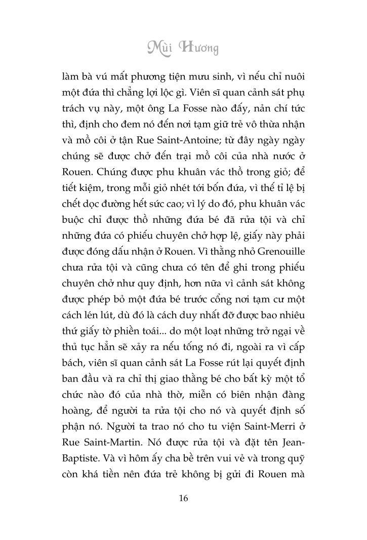 Nhân vật chính của tác phẩm là Jean-Baptise Grenouille, một số phận khác người từ khi mới sinh. Mẹ hắn đã cố tình để mặc hắn chết sặc trông đống ruột cá với mùi máu tanh tưởi. Thế rồi bà ta bị kết án tử hình, còn hắn thì vẫn lớn lên.