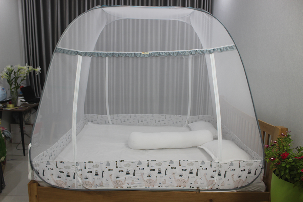 Kiểu dáng: Đỉnh rộng, có 2 cửa ra vào, có viền chân là từ vải nylon thay vì lưới mùng ( giúp bảo vệ 100% khi để tay chân chạm sát mùng)