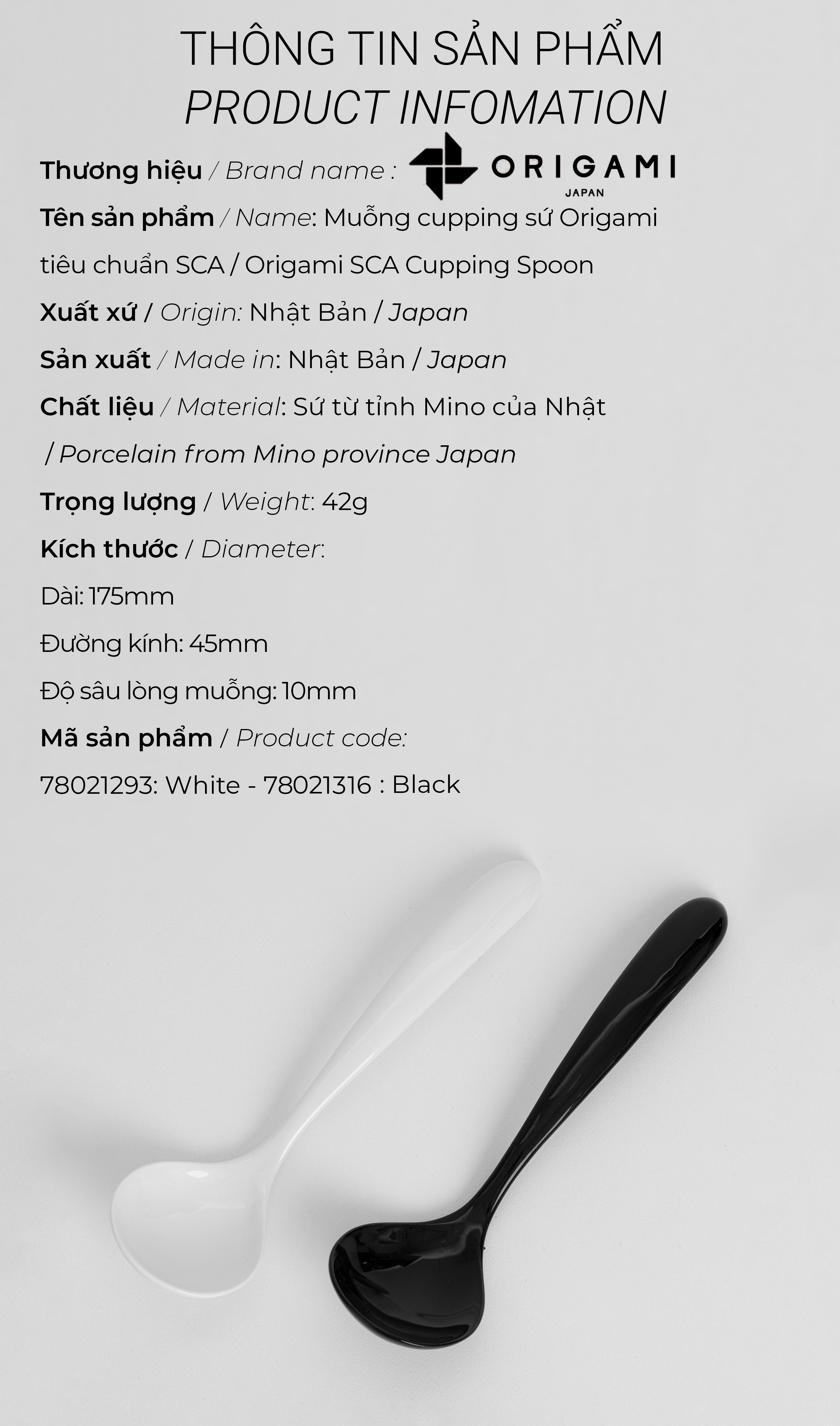 Mua tại TiktokMUỖNG CUPPING BẰNG SỨ THƯƠNG HIỆU ORIGAMI_MADE IN JAPAN Việc thử nếm cà phê bằng muỗng cupping giúp các barista đánh giá toàn diện nhiều mục như vị ngọt, chua, đắng, hương thơm và dư vị của cà phê. Tập trung hết thần kinh và đánh giá ly cà phê trước mặt. Không cần thiết kế quá mức tại thời điểm đó. Nó không cản trở các giác quan của nhân viên pha cà phê, mà nó giải phóng họ. ORIGAMI nhắm đến một chiếc muỗng cupping tối tân như vậy.