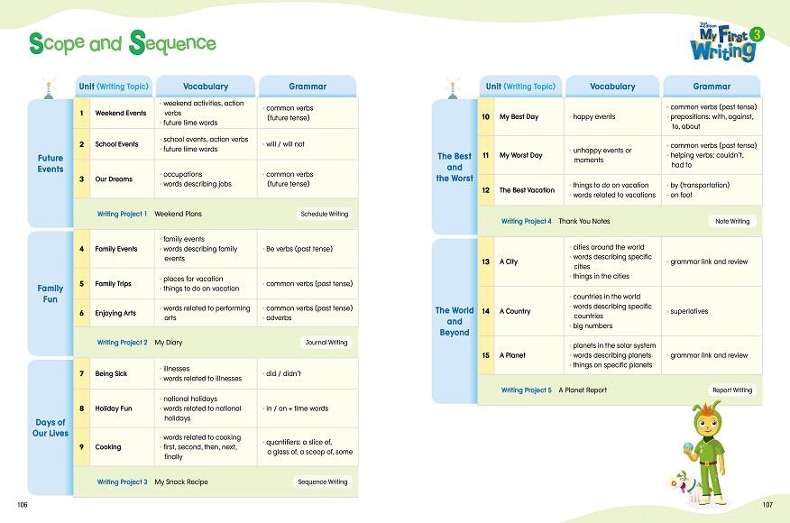 My First Writing is a fun and easy writing series for young EFL beginners designed to help them develop sentence building skills. Throughout the series, students will learn to organize their ideas and practice writing sentences within a context of fun and interesting topics. They will also expand their writing tools such as vocabulary and grammar knowledge through fun activities. Upon finishing the My First Writing series, students will be equipped with basic writing skills for paragraph and essay writing.