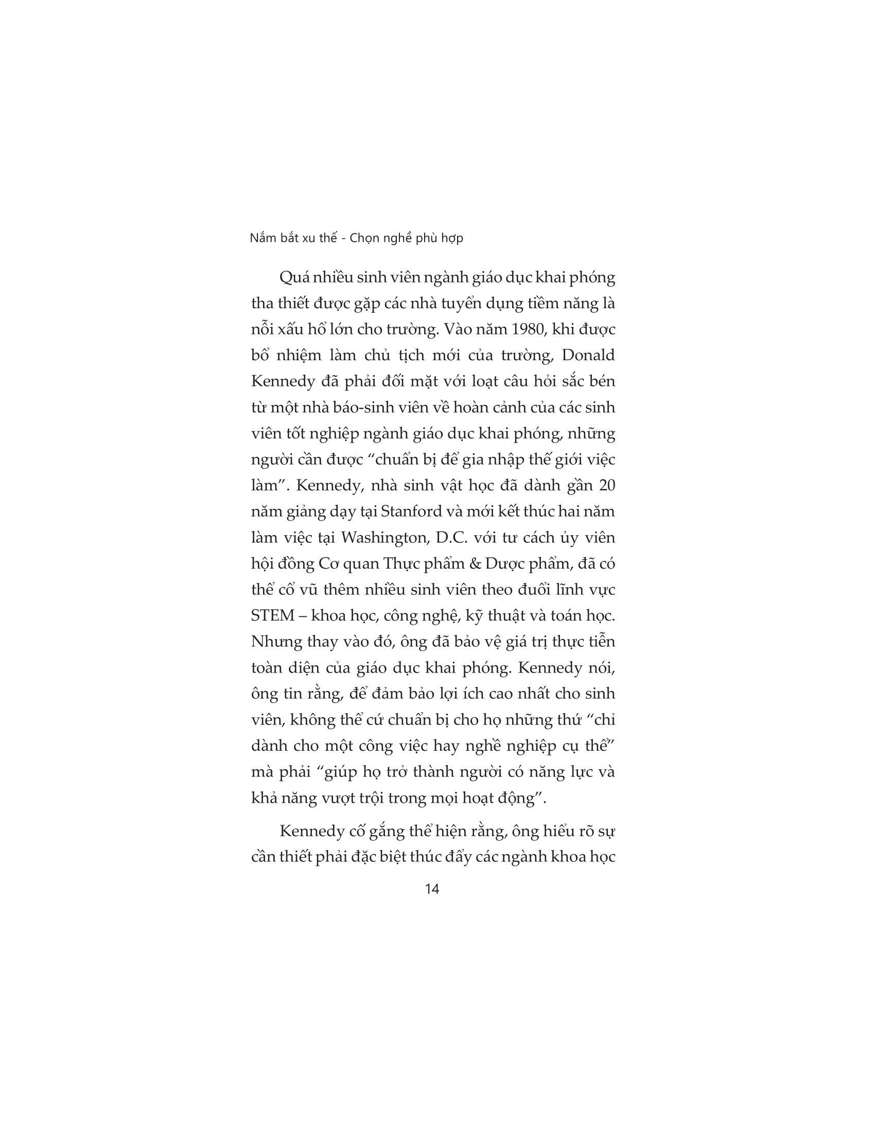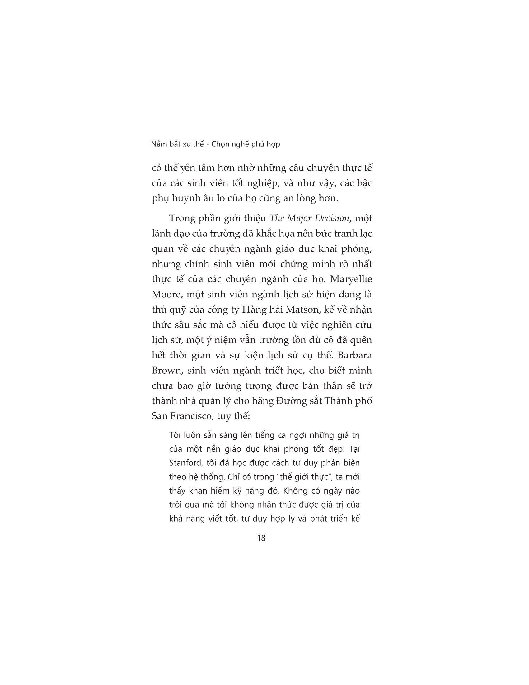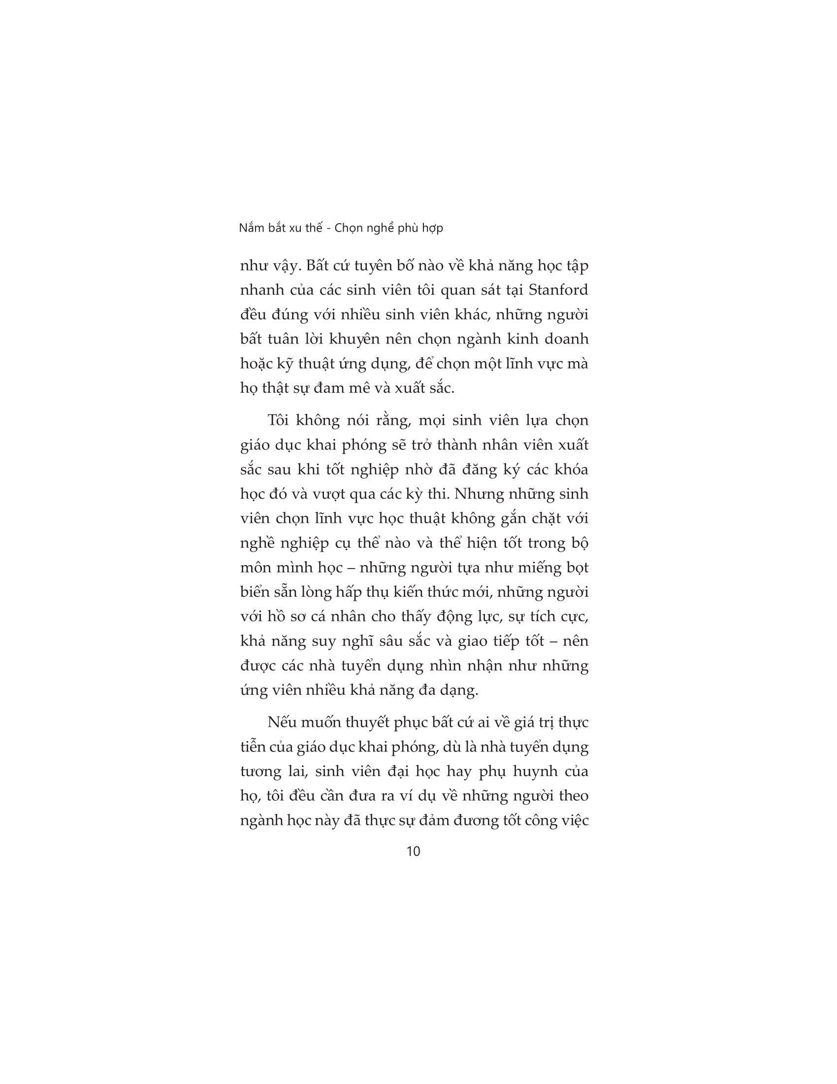 Bất kể ngành học mà bạn muốn hoặc đang theo đuổi là gì, nếu như bạn cảm thấy hoang mang về cuộc sống hậu đại học và muốn trang bị cho bản thân những kỹ năng nghề nghiệp tốt nhất ngay từ bây giờ, hãy bắt đầu bằng cách đọc Nắm bắt xu thế - Chọn nghề phù hợp. Những câu chuyện thực tiễn trong cuốn sách này sẽ cung cấp những lời khuyên và giúp bạn tự rút ra những điều cần làm, ví dụ như tham gia các kỳ thực tập ngay từ năm hai hay xây dựng mạng lưới quan hệ với các cựu sinh viên. Bạn sẽ vừa có thể theo đuổi đam mê tri thức, vừa tích lũy được những kỹ năng mềm và kỹ năng chuyên môn thiết thực để sẵn sàng đối mặt với tương lai bất định.