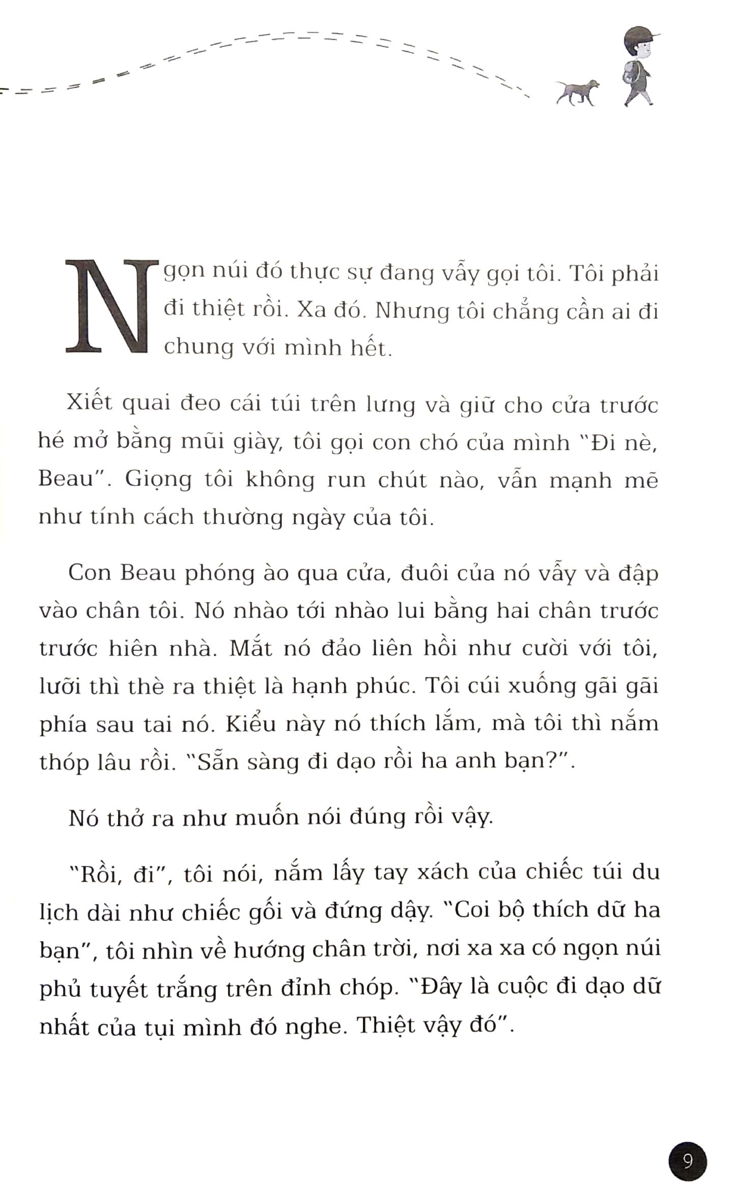 13 chương truyện là sự đan xen những dòng kể đầy cảm xúc của nhiều nhân vật khác nhau, vừa hồi tưởng vừa đi sâu vào tâm lý của từng nhân vật trong truyện, trong đó xoáy sâu nhất là những ký ức của Mark khi tưởng chừng như bản thân đã buộc phải dừng lại giữa đường, cơ thể bầm dập, đau nhừ và sự sống đang rút cạn dần. Bạn có thể mong đợi một đích đến duy nhất nơi đỉnh ngọn núi mây mù bao phủ, khi Mark đứng đó cùng Beau và hét to cho cả thế giới điều thằng bé có thể làm được. Nhưng câu chuyện mà Dan Gemeinhart còn trên mức đó. Đây sẽ là cuộc phiêu lưu kỳ thú chưa từng có, nơi một nhóc thiêu niên tự m.ình đặt ra những câu hỏi lớn về cuộc sống, gắn ghép những mảnh kỷ niệm nhỏ dọc đường đi và với tới những điều không tưởng ở điểm kết thúc.
