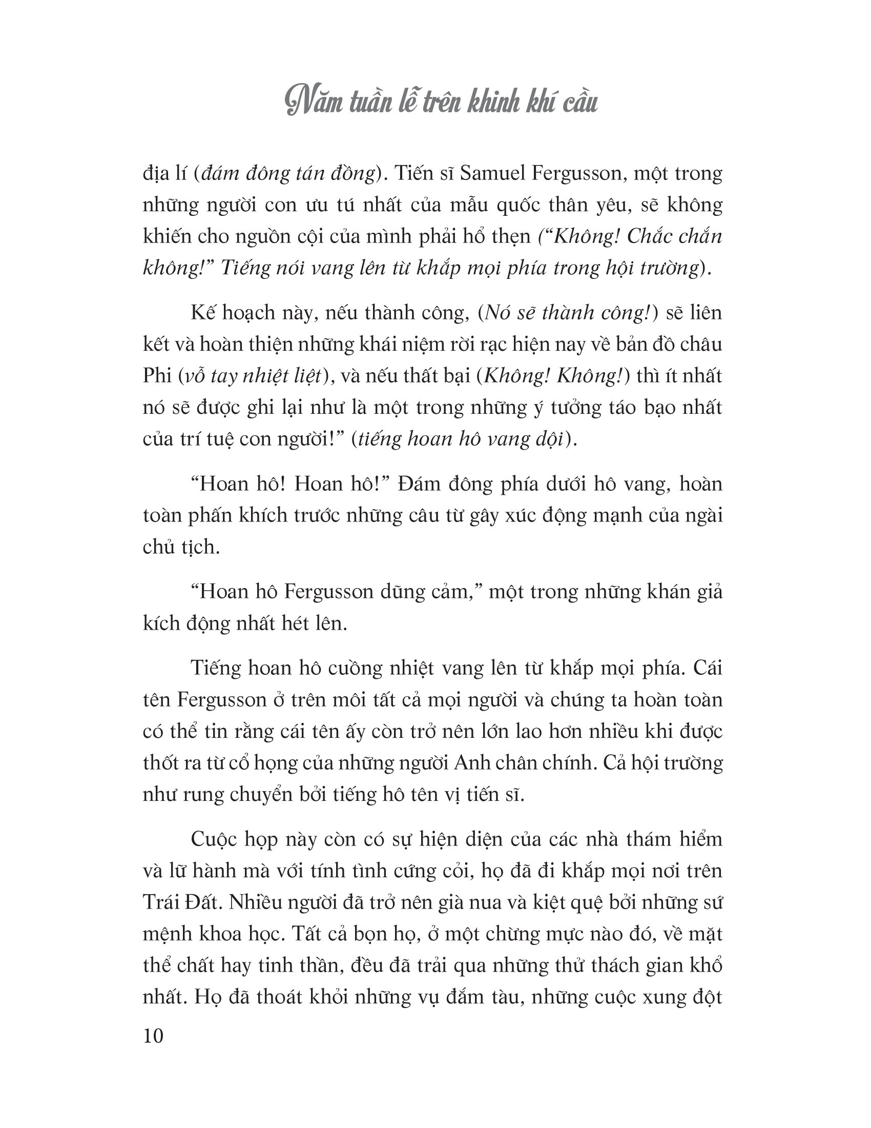 Là một tác phẩm từng bị từ chối bởi nhiều đơn vị xuất bản khi cho rằng nó quá "khoa học", Năm Tuần Lễ Trên Khinh Khí Cầu đã vô cùng thành công và tạo tiếng vang không chỉ riêng nước Pháp mà còn trên toàn thế giới bởi nội dung và lối kể chuyện sinh động, cuốn hút, đan xen cả những nghiên cứu hết sức kĩ càng và hấp dẫn, hứa hẹn sẽ lôi cuốn bạn từ những trang đầu tiên.