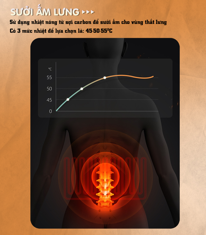 3 mức nhiệt sưởi ấm lưng tùy chỉnh: 45-50-55oC