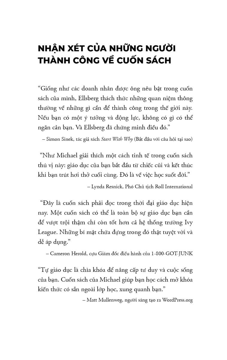 Bạn sẽ thấy được điều đó khi đọc Nền Giáo Dục Của Người Giàu của Michael Ellsberg. Tác giả đã phỏng vấn các tỉ phú và triệu phú không có bằng đại học như ông trùm thời trang Russell Simmons. Bên cạnh đó, Michael Ellsberg còn đưa ra những chỉ dẫn tuyệt vời để bạn tiến tới thành công bằng những kỹ năng vô cùng đơn giản: Để tìm được người hướng dẫn, cách tạo hứng thú trong công việc, cách xây dựng phong cách cá nhân và nhiều hơn thế nữa.