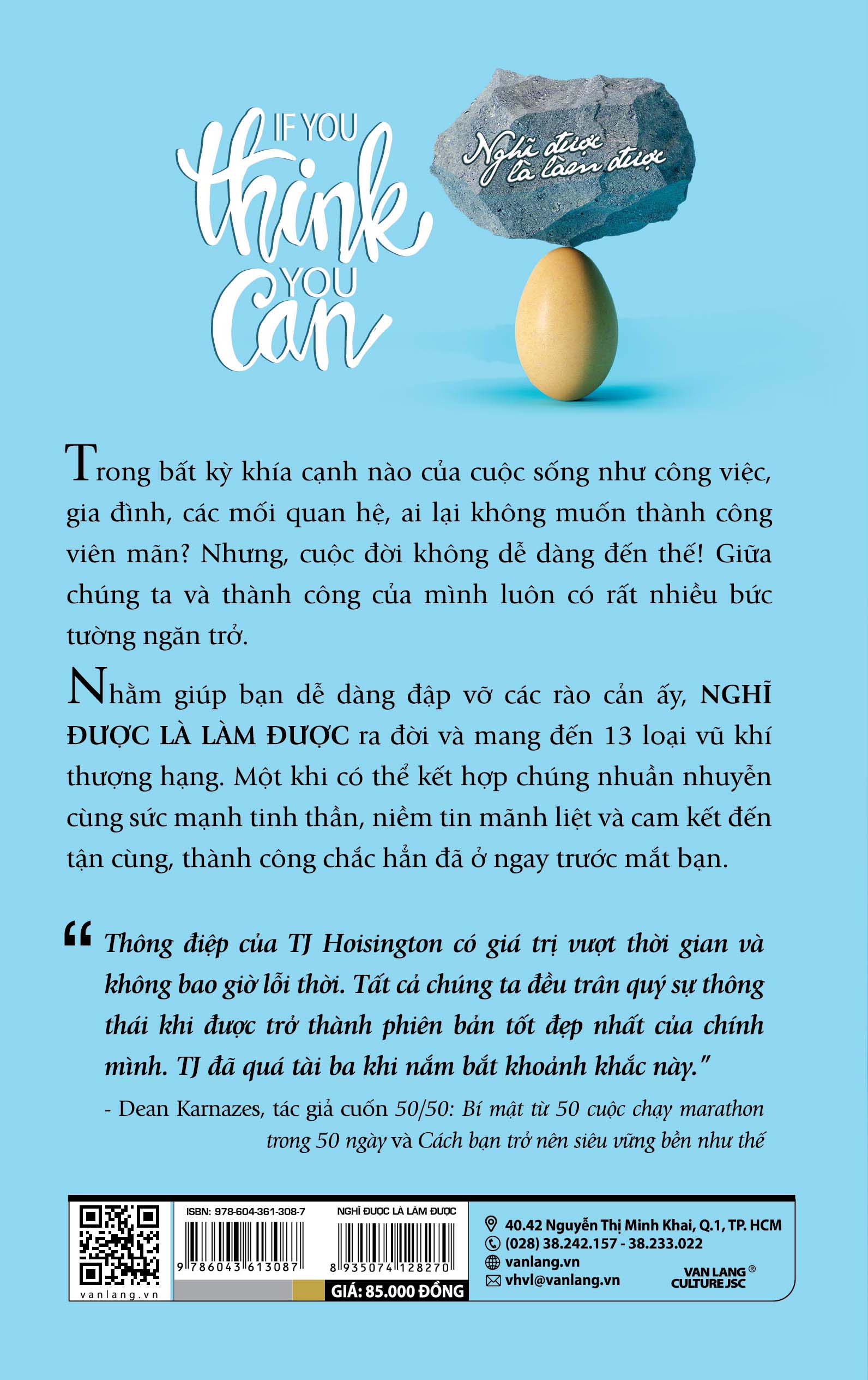 Nhằm giúp bạn dễ dàng đập vỡ các rào cản ấy, NGHĨ ĐƯỢC LÀ LÀM ĐƯỢC ra đời và mang đến 13 loại vũ khí thượng hạng. Một khi có thể kết hợp chúng nhuần nhuyễn cùng sức mạnh tinh thần, niềm tin mãnh liệt và cam kết đến tận cùng, thành công chắc hẳn đã ở ngay trước mắt bạn.