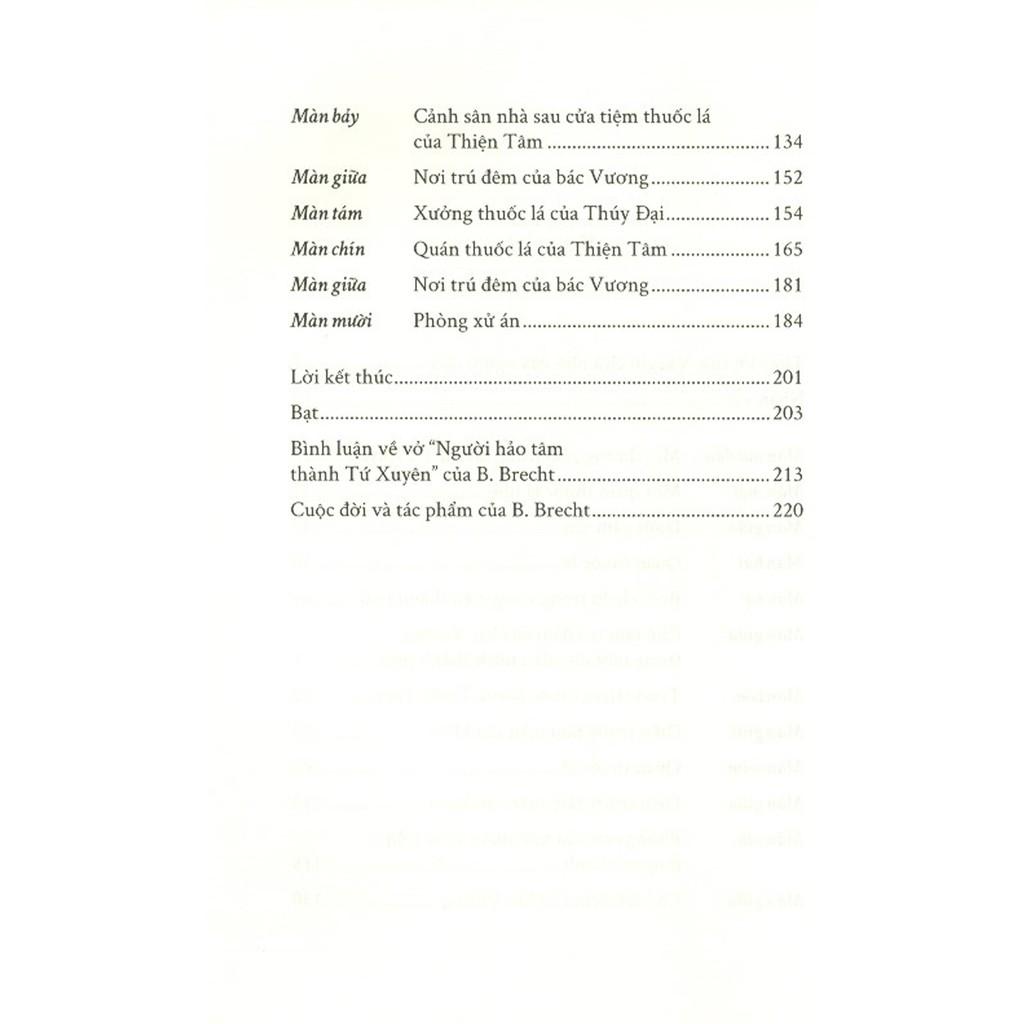 Dưới hình thức một chuyện ngụ ngôn, Brecht đưa ra vấn đề này qua sự trình bày những mâu thuẫn cá nhân và liên kết nó với sự phân tích các tương quan xã hội. Dưới thể dáng của cô gái: Thiện Tâm, Brecht chỉ cho ta thấy những mâu thuẫn xã hội của thời đại: ấy là “vừa tốt và vừa sống còn” thật khó để có thể thực hiện được.