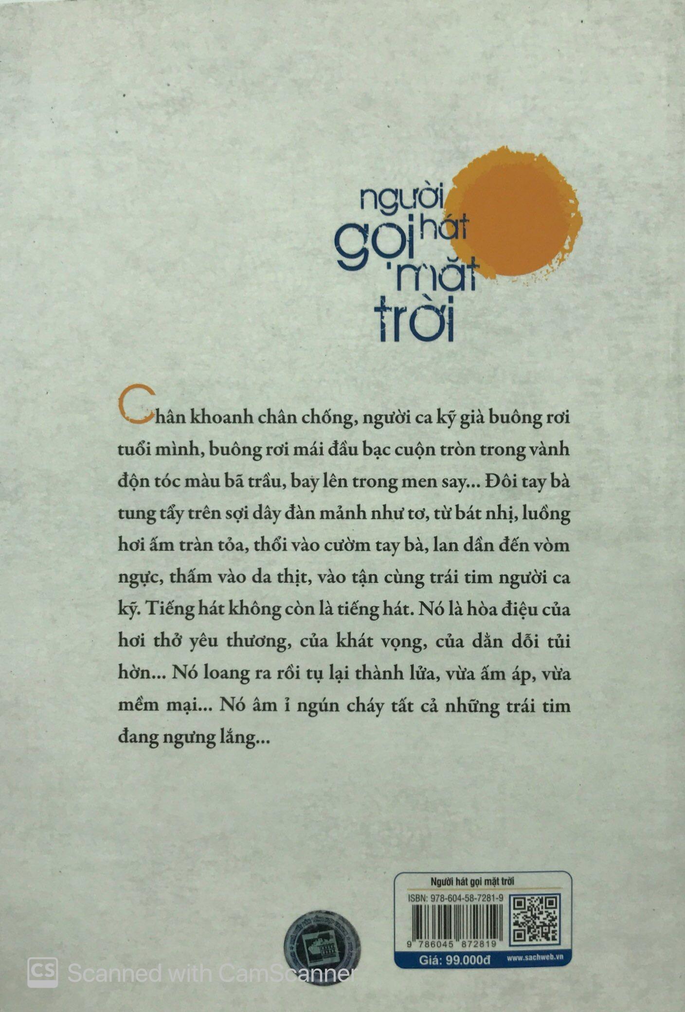 Mua tại TiktokNgười Hát Gọi Mặt Trời Chân khoang chân chống, người ca kỹ già buông rơi tuổi mình, buông rơi mái đầu cuộn tròn trong vành độn tóc màu bã trầu, bay lên trong men say… Đôi tay bà tung tẩy trên sợi dây đàn mảnh như tơ, từ bát nhị, luồng hơi ấm tràn tỏa, thổi vào cườm tay bà, lan dần đến vòm ngực, thấm vào da thịt, vào tận cùng trái tim người ca kỹ. Tiếng hát không còn là tiếng hát. Nó là hòa điệu của hơi thở yêu thương, của khát vọng, của dằn dỗi tủi hờn… Nó loang ra rùi tụ lại thành lửa, vừa ấm áp, vừa mềm mại… Nó âm ỉ ngún cháy tất cả những trái tim đang ngưng lắng…