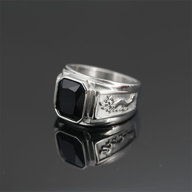 ✨Nhẫn nam titan thời trang chạm rồng 2 bên trangsucpt đá đen nhẫn màu trắng thép không gỉ PTNNA251