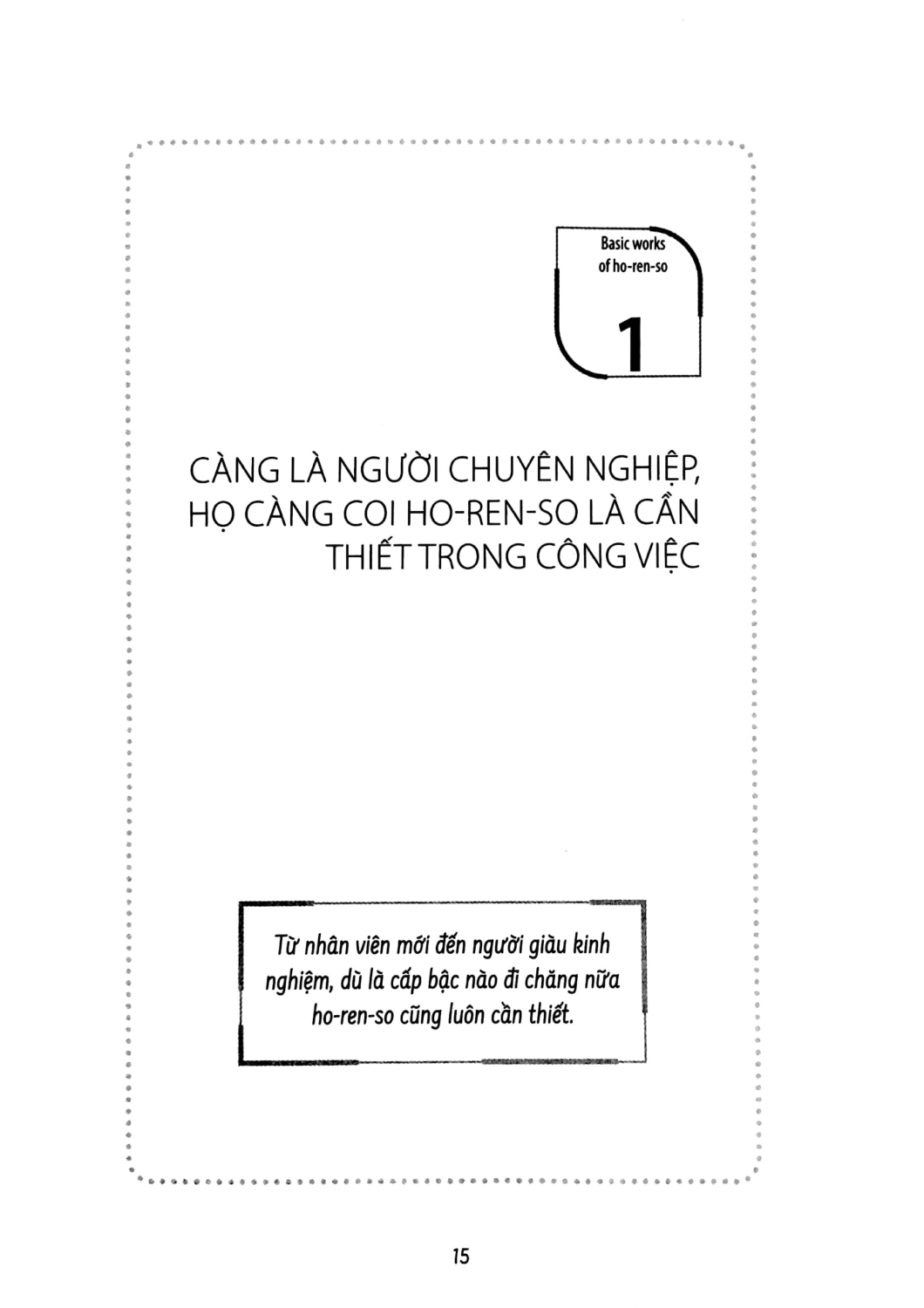 Cuốn sách này sẽ đặt trọng điểm vào kỹ năng cơ bản, thậm chí có khi bạn sẽ nghĩ là không cần thiết, đó chính là kỹ năng Horenso. Đối tượng phù hợp nhất với cuốn sách này là nhân viên trẻ đang phải đau đầu với những thắc mắc như không được đánh giá cao dù đang rất nỗ lực làm việc hết mình, hay công việc không tiến triển như mong muốn.