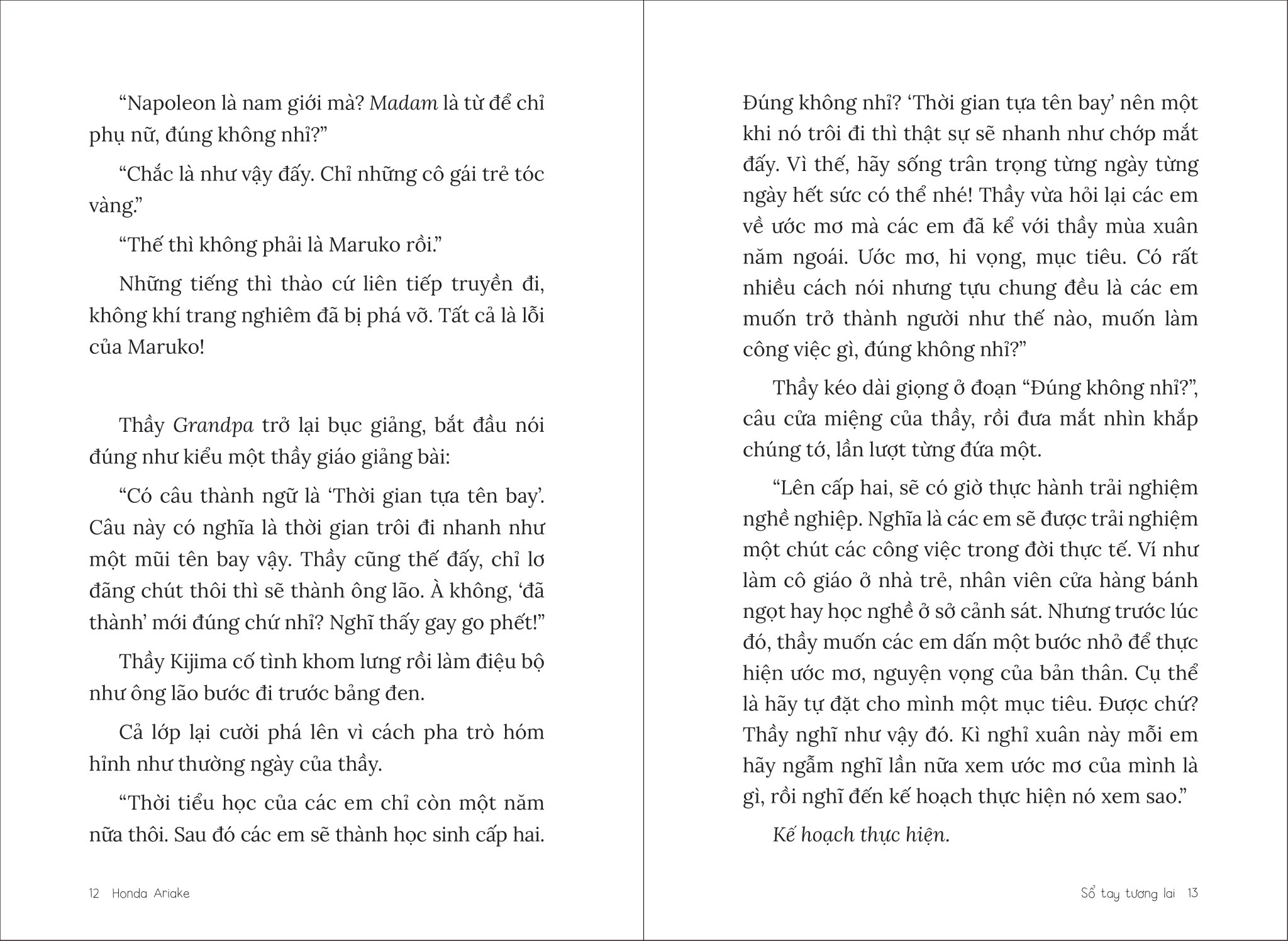 Haruto có rất nhiều cách thực hiện, nào là “Sổ tay tương lai”, “Bảng triển khai lí luận” hay “Kịch bản tương lai hai tầng”, rồi cả nhật kí tuần, đến mức ai cũng lo lắng “Liệu cậu ấy có ôm đồm quá không?” Nếu đọc cuốn sách này mà bạn cảm thấy có hứng thú với một thứ bất kì nào trong các thứ ấy, bạn hãy thử làm theo xem thế nào nhé. Tôi tin, dần dần bạn sẽ tìm ra mẫu mục tiêu dễ viết với mình, và hãy làm “Sổ tay tương lai” theo phong cách riêng của bạn nhé.