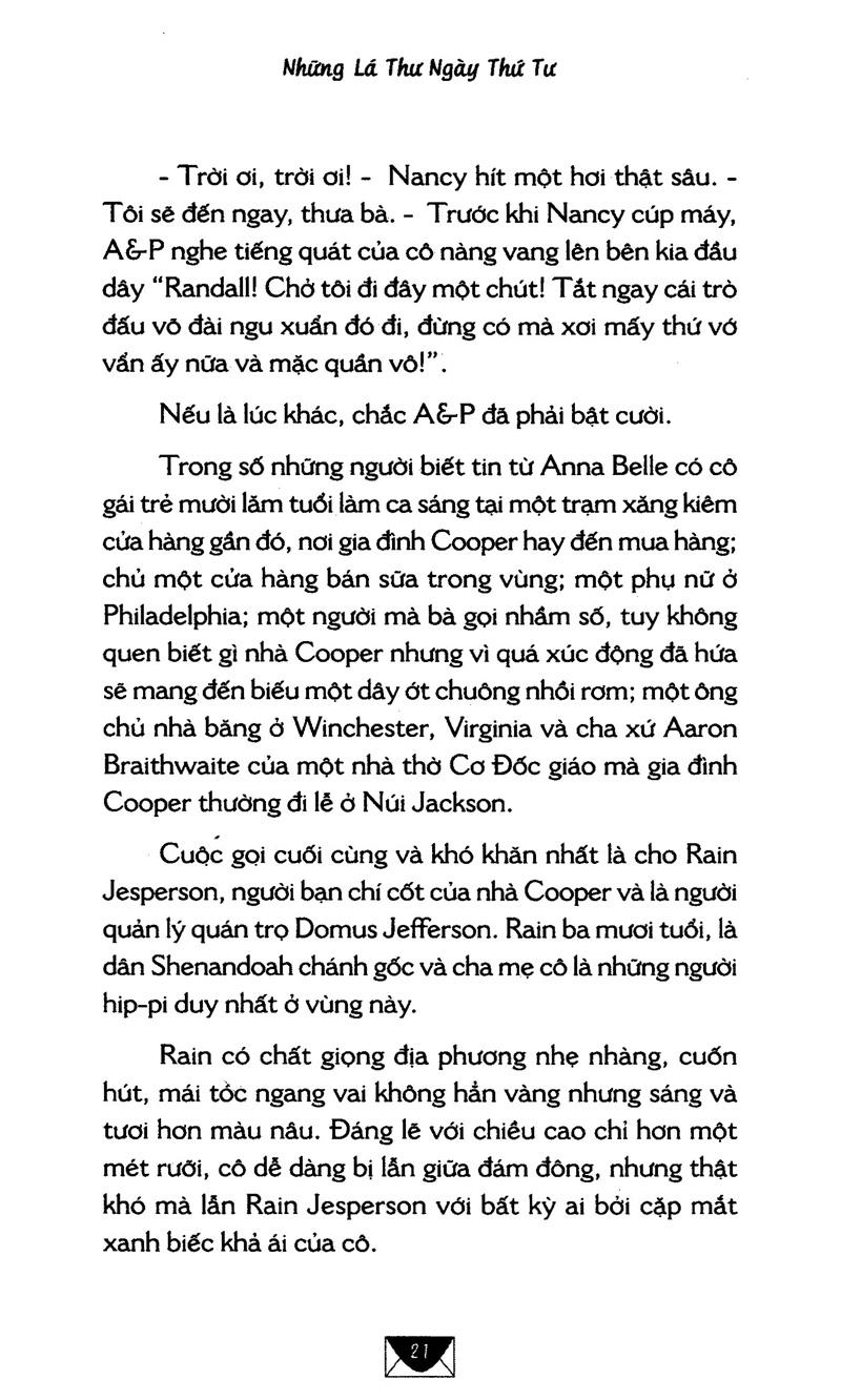 Hôm nay lúc ở nhà thờ anh đã lập một lời hứa thiêng liêng và tối nay anh sẽ lập thêm một lời hứa khác. Anh sẽ viết thư cho em mỗi tuần. Cho dù chúng ta ở cách xa nhau hàng ngàn cây số hay cùng ở trong một gian phòng thì anh vẫn sẽ đều đặn viết thư cho em. Anh đã định viết nhật ký đấy nhưng rồi anh sợ mình không duy trì được. Mà ai thèm quan tâm đến nhật ký của anh chứ? Nhưng nếu là thư thì sẽ có người quan tâm, và chúng sẽ tồn tại lâu dài..."