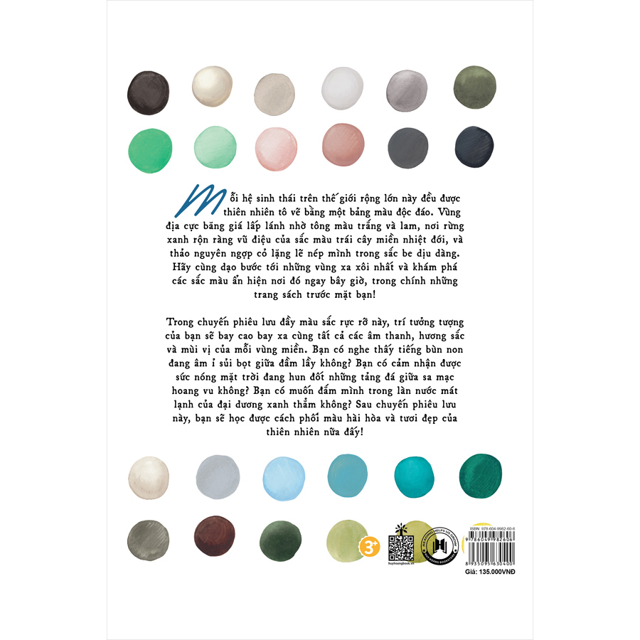 Mỗi hệ sinh thái trên thế giới rộng lớn này đều được thiên nhiên tô vẽ bằng một bảng màu độc đáo. Vùng địa cực băng giá lấp lánh nhờ tông màu trắng và lam, nơi rừng xanh rộn ràng vũ điệu của sắc màu trái cây miền nhiệt đới và thảo nguyên ngợp cỏ lặng lẽ nép mình trong sắc be dịu dàng. Hãy cùng dạo bước tới những vùng xa xôi nhất và khám phá các sắc màu ẩn hiện nơi đó ngay bây giờ, trong chính những trang sách trước mặt bạn!