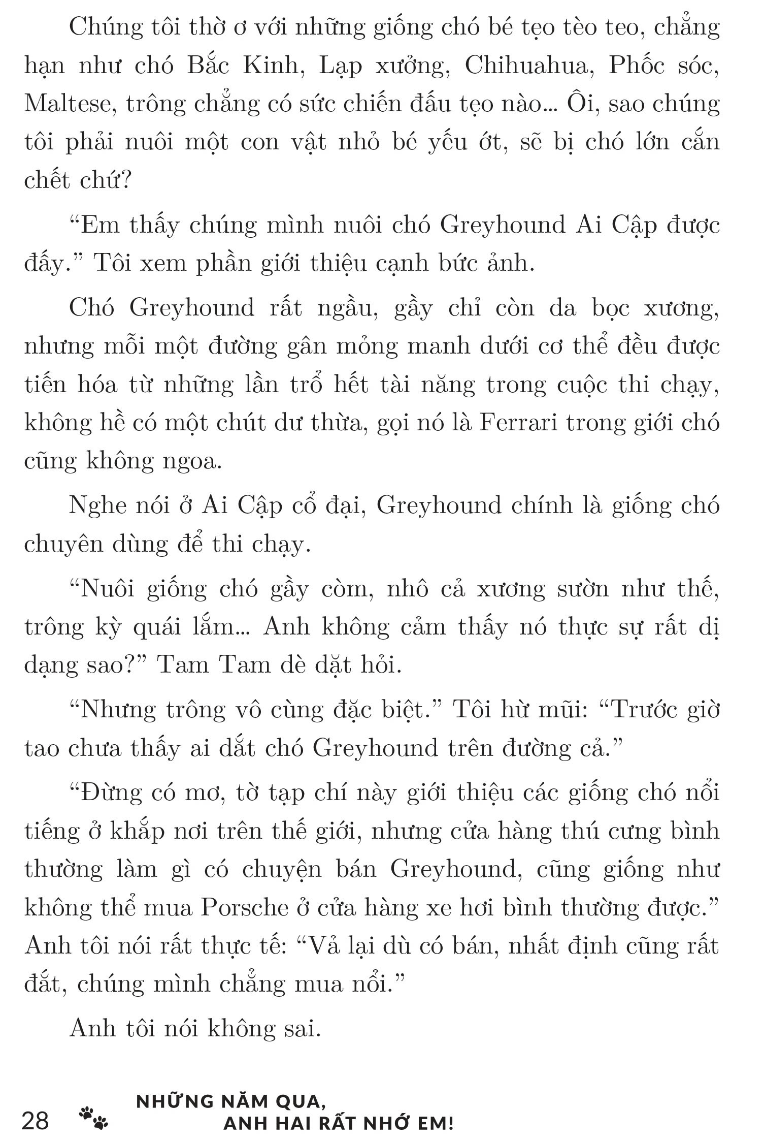 Những năm qua, anh hai rất nhớ em là cuốn sách được viết dưới góc nhìn của Puma – chú chó đã làm bạn 14 năm với Cửu Bả Đao, kể lại về thời niên thiếu của tác giả: từ một người sợ chó vô cùng đến người tự xưng là “anh hai” của Puma, từ một người viết tiểu thuyết qua mạng được vài người quan tâm đến trở thành một tác giả, đạo diễn có nhiều tác phẩm nổi tiếng….