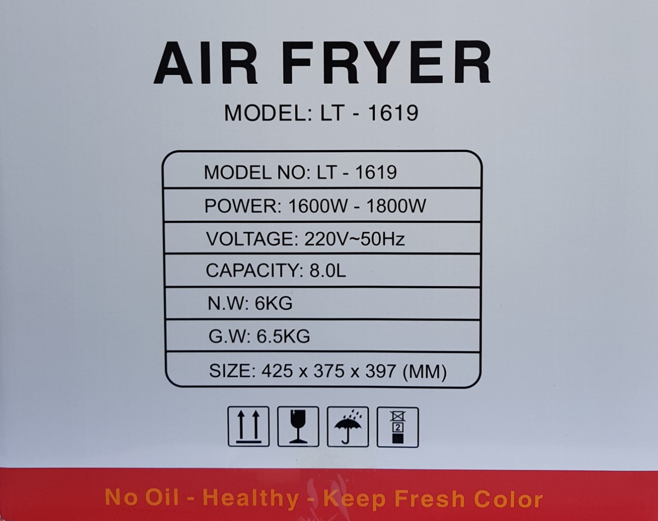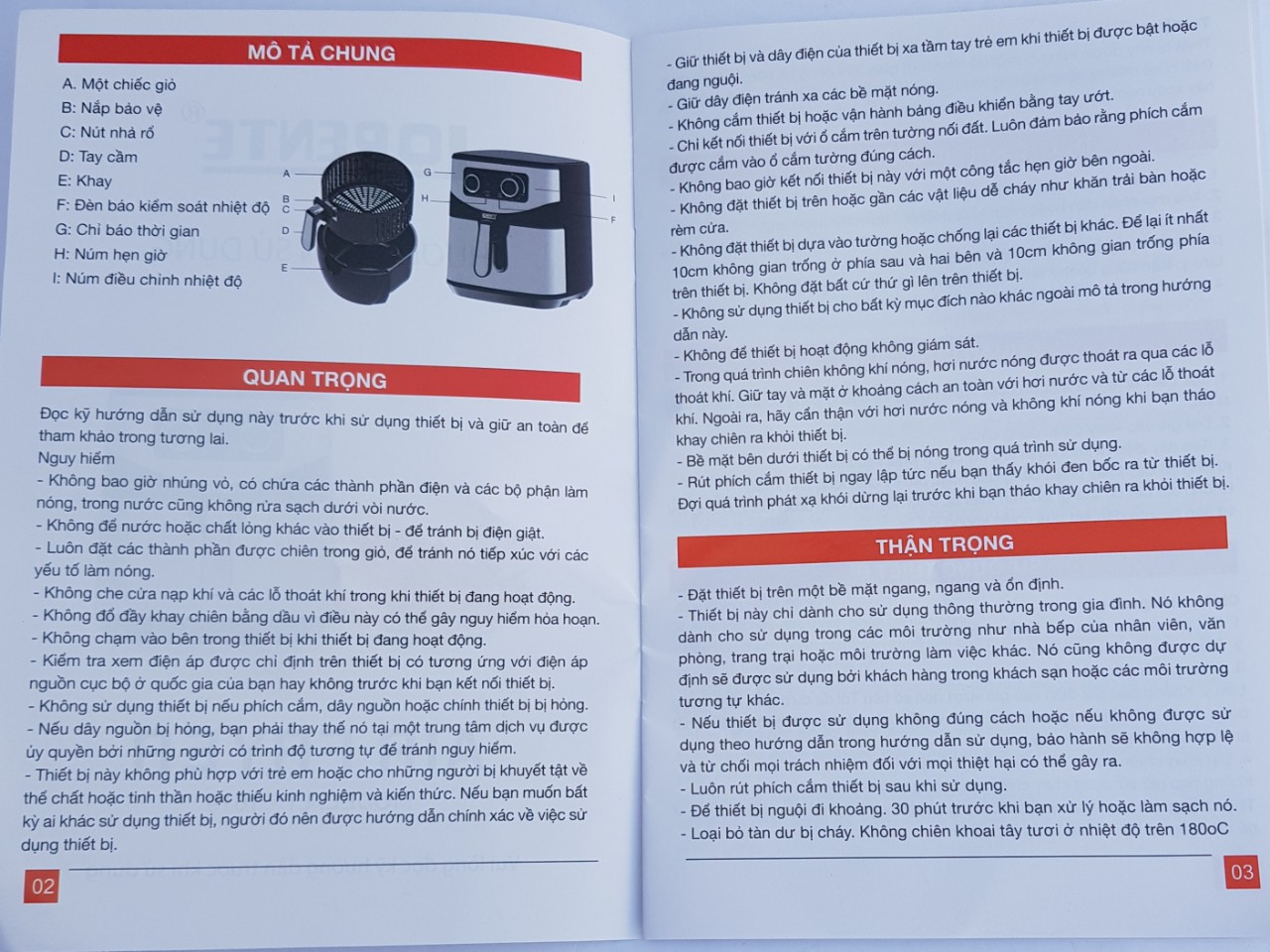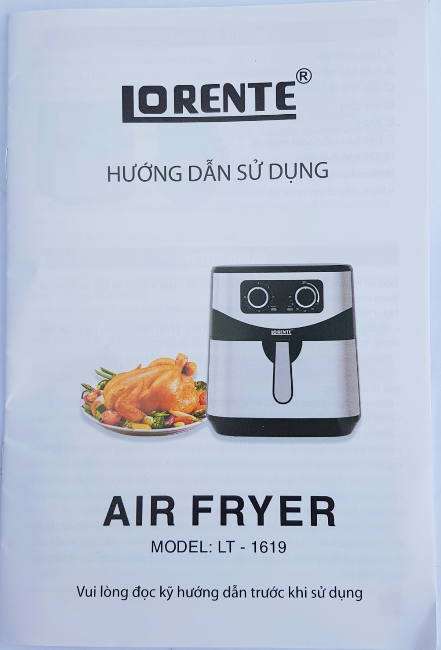 Nút tháo lòng nồi, Cố định giữ lòng nồi và Giỏ chiên Thông số Kỹ thuật Model: Lorente LT-1619 Điện áp: 220V Công suất: 1600W-1800W Kích thước: 403538cm