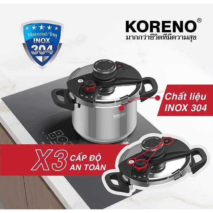 -Nồi áp suất đáy từ đa lớp KORENO là sản phẩm rất cần có trong các gia đình giúp ninh hầm thực phẩm, nấu cháo, kho thịt, hầm chè, canh, súp, nhanh nhừ chỉ sau thời gian ngắn.