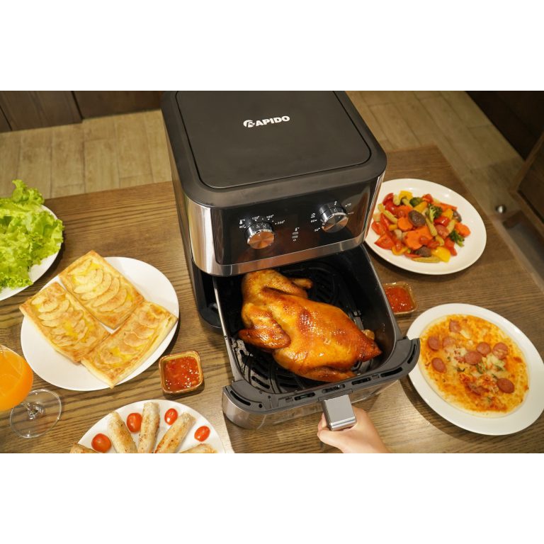 Nồi chiên không dầu Rapido RAF 8.0M có dung tích lên đến 8L, kích thước lòng nồi rộng 25,5cm, chiên nướng được gà nguyên con 2 – 3 kg.
