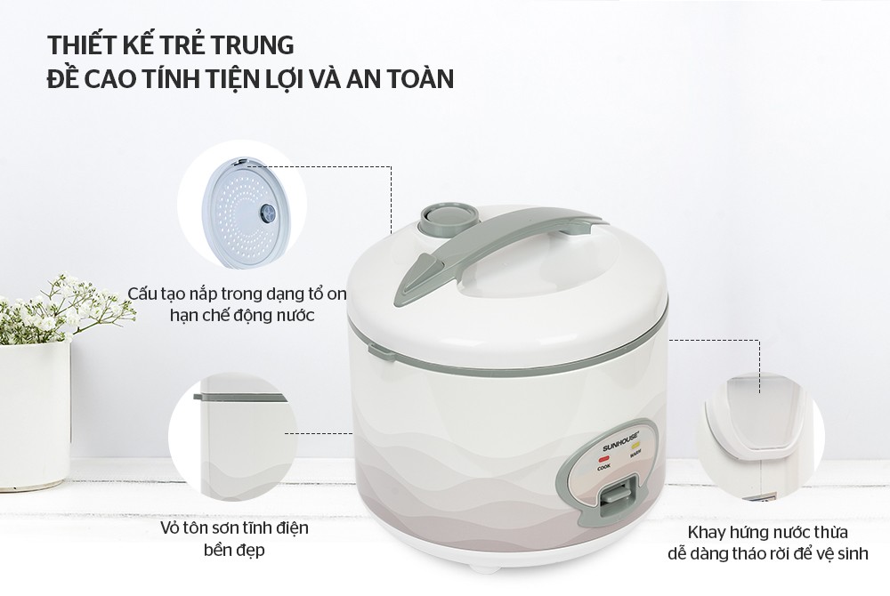 Nồi cơm điện SUNHOUSE 1.8L SHD8602 KIỂU DÁNG TRẺ TRUNG – TIỆN DỤNG VÀ AN TOÀN Thiết kế đơn giản, trẻ trung và an toàn Nồi cơm điện SUNHOUSE 1.8L SHD8602 được thiết kế với