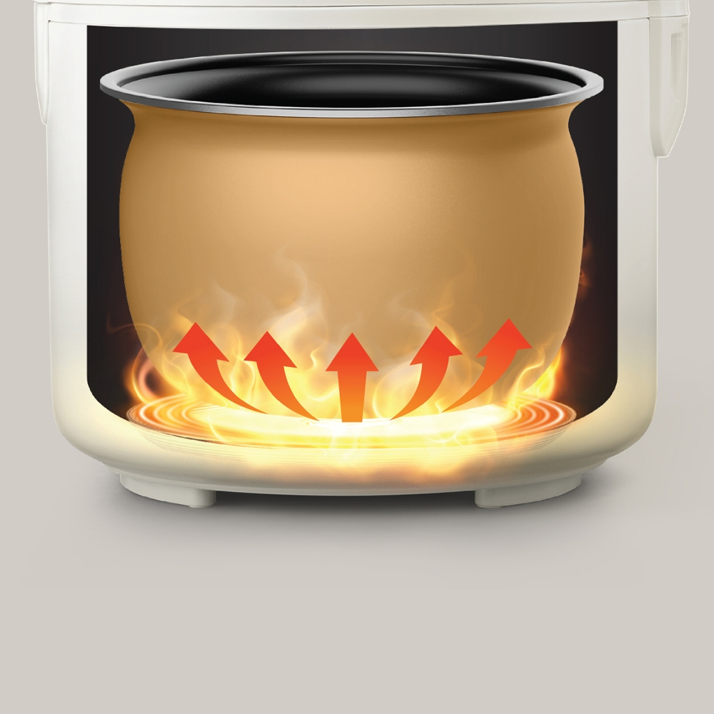 - Cấu tạo: Nhôm, nhựa PP ĐẶC ĐIỂM SẢN PHẨM: LÒNG NỒI HÌNH CẦU DÀY DẶN: Truyền nhiệt đều, nấu cơm tơi xốp và ngon hơn MÂM NHIỆT CHỮ U: Giữ nhiệt tối ưu – cơm ngon chuẩn vị. NẮP TRONG CÓ THỂ THÁO RỜI: Dễ dàng tháo lắm, làm sạch nhanh chóng LÒNG NỒI PHỦ CHỐNG DÍNH: Dễ vệ sinh hơn, hạn chế bám dính – giảm lãng phí thực phẩm. ĐIỀU KHIỂN CHỈ VỚI MỘT NÚT NHẤN: Tự động giữ ấm, cơm luôn sẵn sàng THIẾT KẾ TRANG NHÃ: Tông màu tím và ngà sang trọng mang đến vẻ ngoài cao cấp. GIỮ ẤM 4 TIẾNG: Thức ăn luôn ấm và sẵn sàng LƯU Ý VÀ CẢNH BÁO: