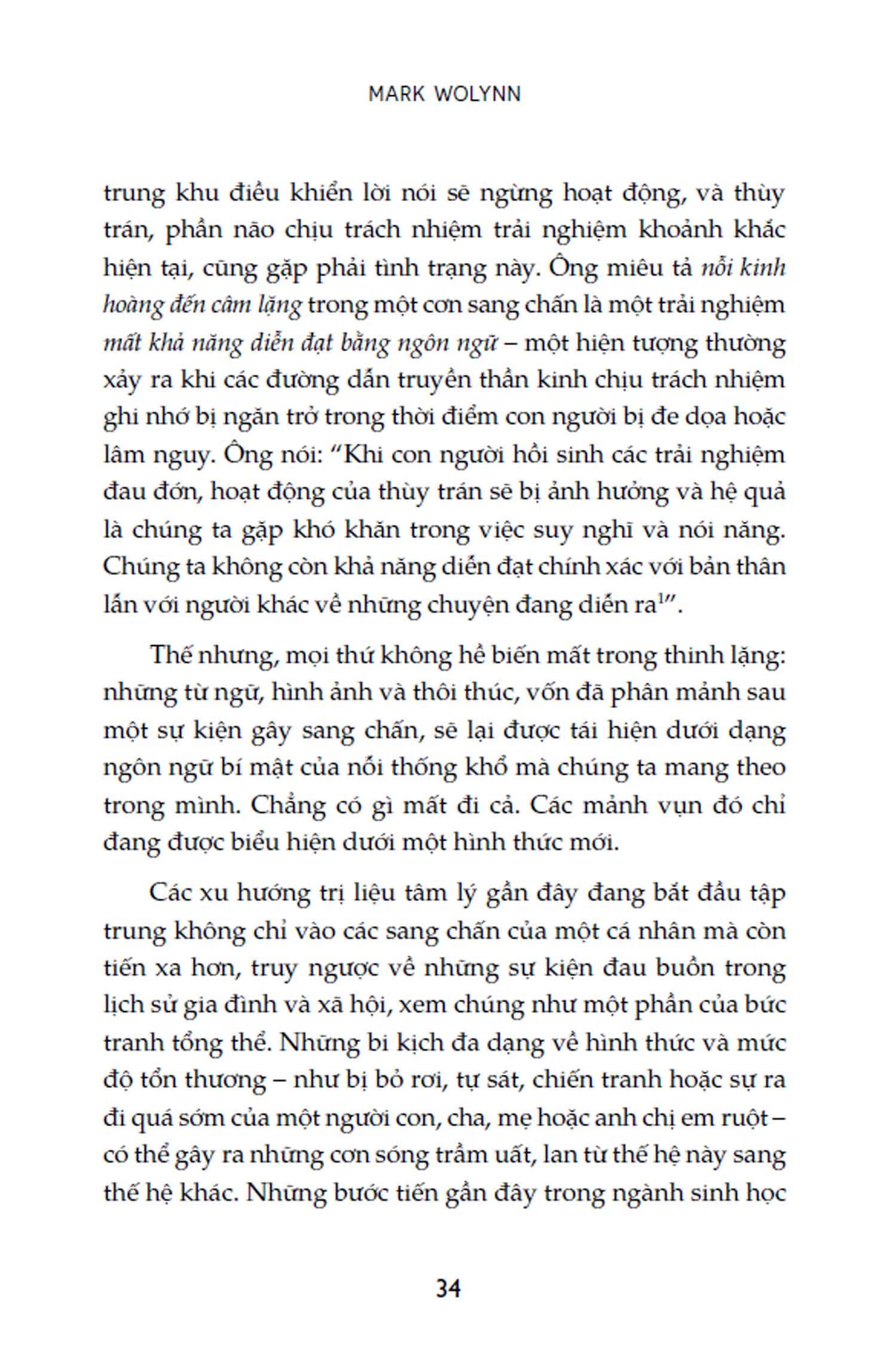 • “Cuốn sách mang tính đột phá này cung cấp những kiến thức vô cùng thuyết phục về chấn thương liên thế hệ cũng như những công cụ mới lạ và mạnh mẽ để làm giảm bớt nỗi đau đó. Mark Wolynn thực sự là một người hướng dẫn khôn ngoan và đáng tin cậy trên hành trình chữa lành này.” – Tiến sĩ Tara Brach, tác giả cuốn Radical Acceptance and True Refuge.