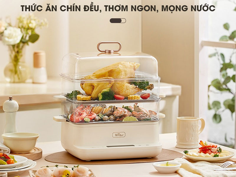 - Thiết kế đa tầng: Nồi hấp Bear EFS-4H27E thường có nhiều tầng hấp (phổ biến là 2 hoặc 3 tầng), cho phép bạn hấp cùng lúc nhiều loại thực phẩm khác nhau (ví dụ: