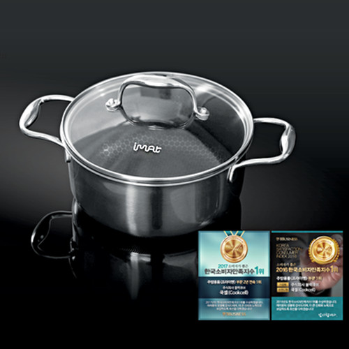 Vung nồi bằng thuỷ tinh chịu nhiệt, trong suốt nên dễ quan sát thực phẩm trong khi nấu. Logo iMat in sắc nét trên vung và đáy nồi.