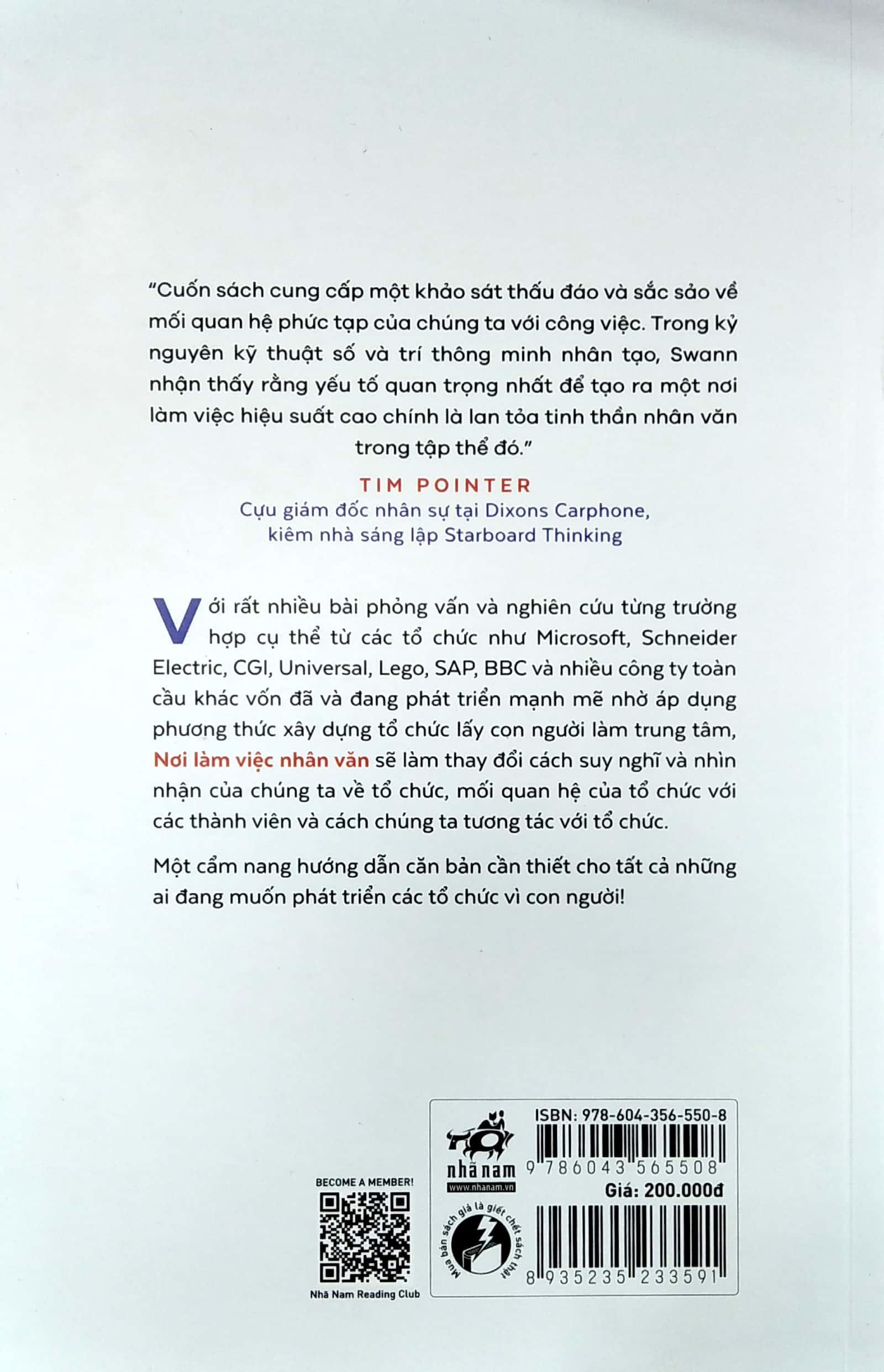 Nơi Làm Việc Nhân Văn - The Human Workplace “Cuốn sách cung cấp một khảo sát thấu đáo và sắc sảo về mối quan hệ phức tạp của chúng ta với công việc. Trong kỷ nguyên kỹ thuật số và trí thông minh nhân tạo, Swann nhận thấy rằng yếu tố quan trọng nhất để tạo ra một nơi làm việc hiệu suất cao chính là lan tỏa tinh thần nhân văn trong tập thể đó.” TIM POINTER Cựu giám đốc nhân sự tại Dixons Carphone, kiêm nhà sáng lập Starboard Thinking Với rất nhiều bài phỏng vấn và nghiên cứu từng trường hợp cụ thể từ các tổ chức như Microsoft, Schneider Electric, CGI, Universal, Lego, SAP, BBC và nhiều công ty toàn cầu khác vốn đã và đang phát triển mạnh mẽ nhờ áp dụng phương thức xây dựng tổ chức lấy con người làm trung tâm, Nơi làm việc nhân văn sẽ làm thay đổi cách suy nghĩ và nhìn nhận của chúng ta về tổ chức, mối quan hệ của tổ chức với các thành viên và cách chúng ta tương tác với tổ chức. Một cẩm nang hướng dẫn căn bản cần thiết cho tất cả những ai đang muốn phát triển các tổ chức vì con người! Andy Swann Nhà sáng lập kiêm CEO của My Amazing Team, chuyên gia nghiên cứu và xây dựng mối kết nối giữa con người và tổ chức, từng xây dựng các dự án sáng tạo độc đáo và có tác động sâu sắc cho các tổ chức và thương hiệu lớn nhất hành tinh. Ông là khách mời thường xuyên trên các phương tiện thông tin đại chúng uy tín như BBC, NBC, ABC, Fox trong các chương trình chia sẻ kinh nghiệm.