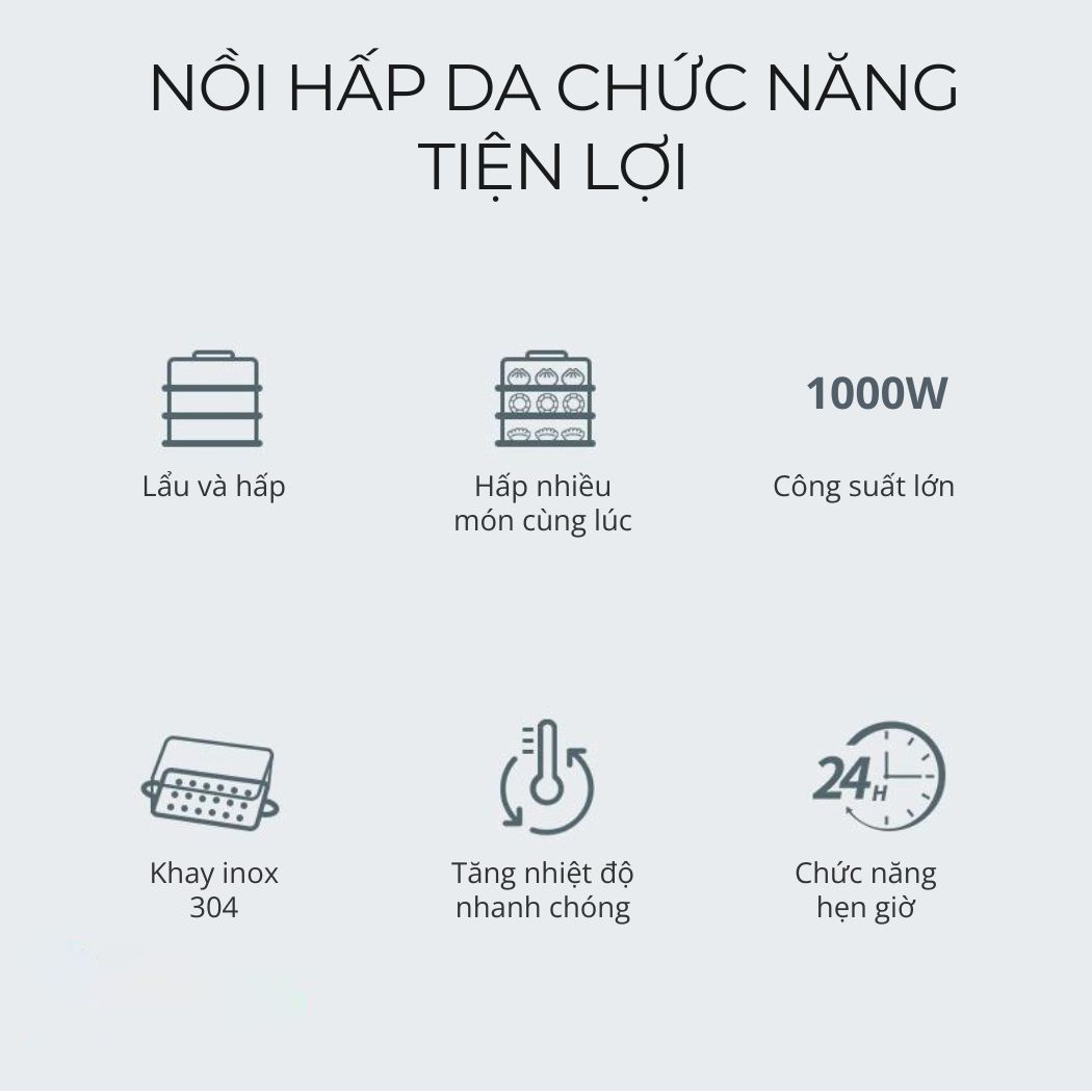 Công suất 700w - Hai mức nhiệt điều chỉnh - Dung tích 1,6 L - Dưới ăn lẩu, xào nấu, trên vỉ hấp - Nắp kính cường lực - Lòng nồi phủ sứ Titan Bảo