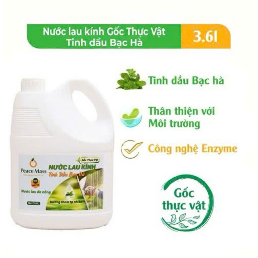 Nước lau kính hữu cơ Tinh dầu Bạc hà Peace Mass Can 3600ml sử dụng Công nghệ Enzyme làm sạch bề mặt kính, gương, pha lê, không để lại vết sọc, hương thơm tự nhiên,