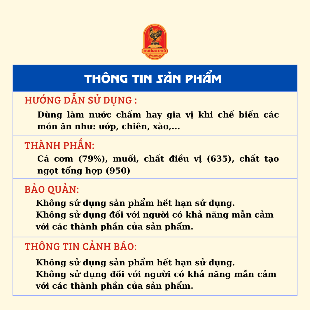 Với 100% cá cơm tươi, béo ú được chọn lựa kỹ được kết hợp với muối tinh khuyết được ủ bằng phương pháp truyền thống trong thùng gỗ được lên men tự nhiên, sau 18 đến 24 tháng những dòng nước cốt nguyên chất, không pha được rút, nhỉ ra từng giọt mắm màu cánh gián đẹp mắt, đậm đà hậu vị ngọt dịu, được đóng chai tạo nên Nước mắm cá cơm HƯƠNG PHÚ 40 độ đạm.