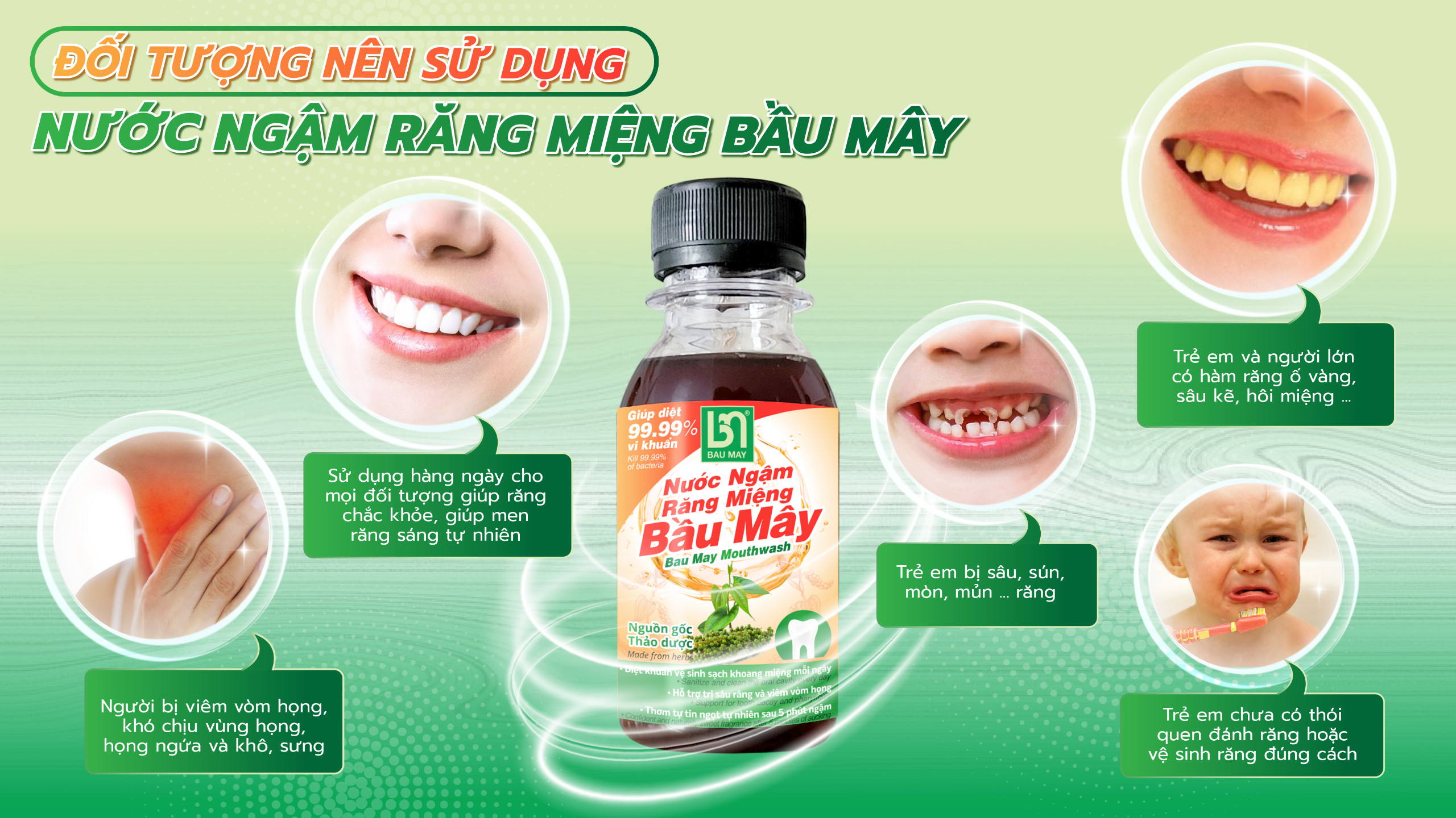 Nước ngậm răng miệng Bầu Mây là sản phẩm được chế biến từ các thành phần tự nhiên như Tiêu Bầu Mây, nhụy tiêu, Hoài sơn Bầu Mây, rượu Hoài sơn Bầu Mây và cam