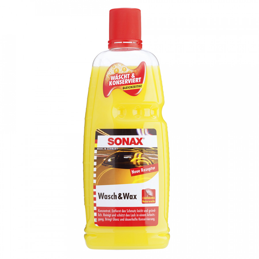 Nước rửa xe và wax bóng sơn kết hợp Sonax Wash & Wax 313341 1000ml   SONAX Wash & Wax 313341 1000ml là sản phẩm rất hay, kết hợp hoàn hảo giữa nước rửa xe Sonax Gloss Shampoo và Wax bóng sơn Sonax Sản phẩm làm sạch, loại bỏ bụi bẩn và sự kết hợp một màng wax sáp bền Carnauba tự nhiên bảo vệ sơn trong một thao tác. Mang lại độ sáng bóng và bảo quản sơn xe khỏi tác hại của tia UV. Với SONAX Wash & Wax 313341 thì việc chăm sóc sơn xe đặc biệt nhanh chóng, dễ dàng làm sạch và bảo vệ màu sơn chiếc xe trong một chu trình. Loại bỏ các bụi bẩn, vết dơ cứng đầu 1 cách dễ dàng và triệt để, mang lại độ bóng và bảo quản sơn xe lâu dài, với chất lượng wax sáp cao cấp Carnauba – Naturwachs.