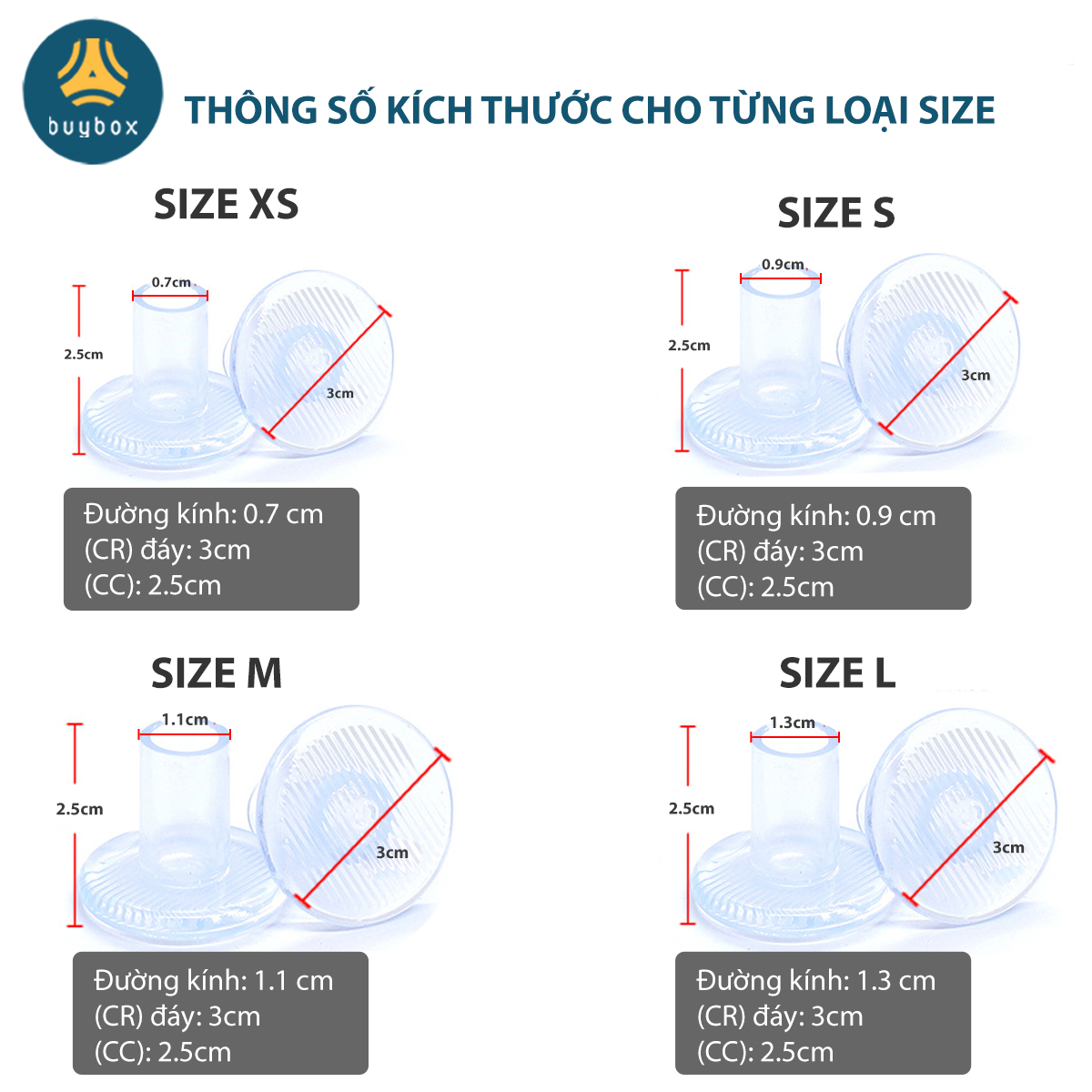 - Kích thước đường kính trong: XS (0.7cm), S (0.9cm), M(1.1cm), L (1.3cm)