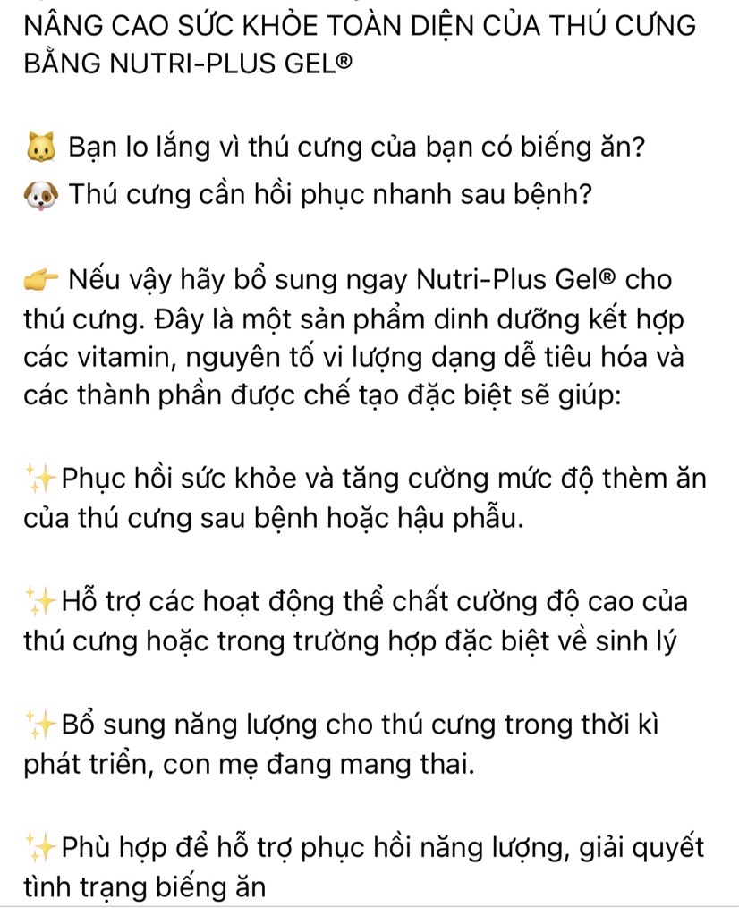- Sản phẩm chính hãng của công ty Virbac (Pháp). Nutri Plus Gel được khuyến cáo sử dụng trong những trường hợp như: