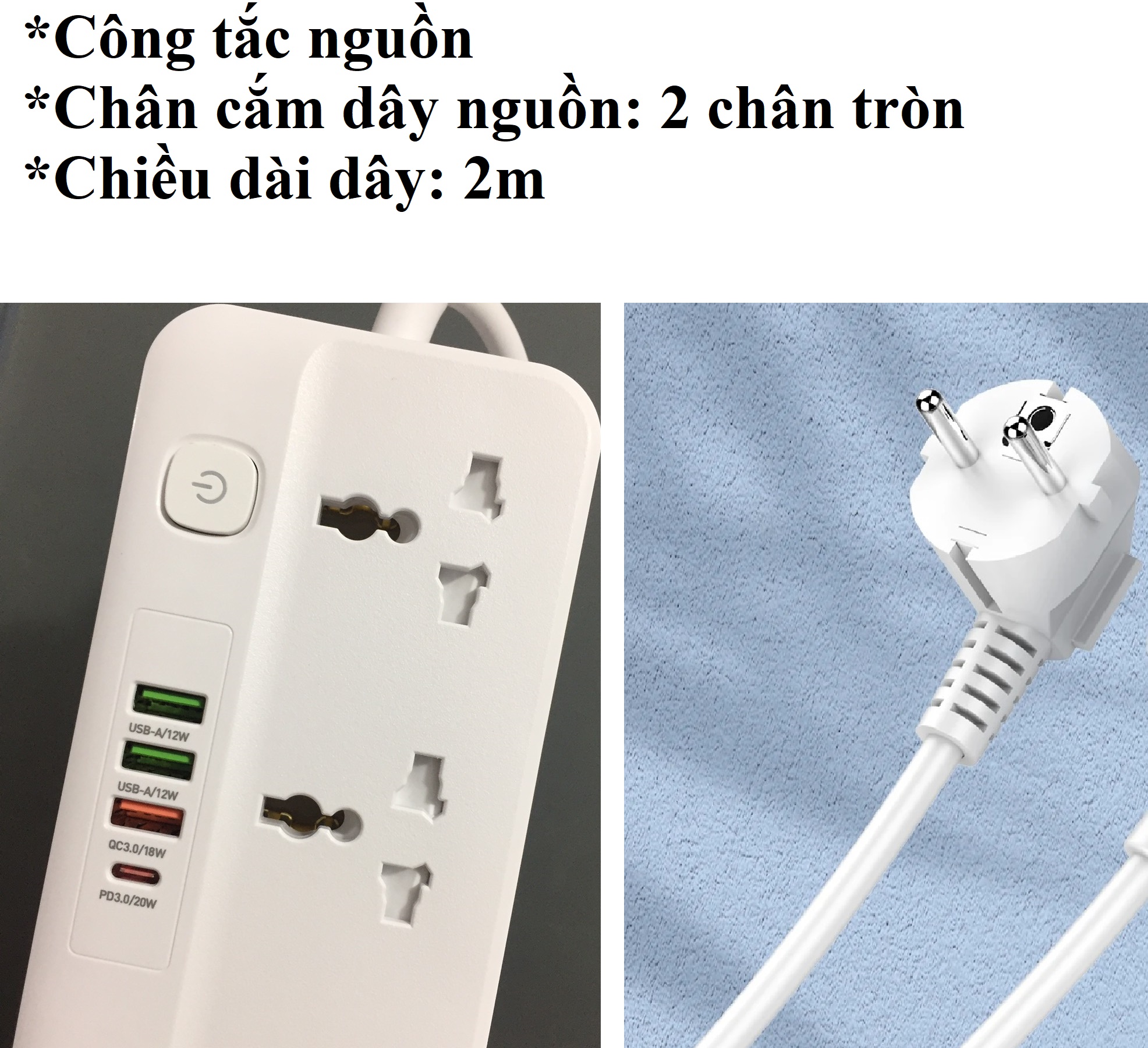 Ổ cắm 3 ổ đa năng + 2 ổ cắm USB cách điện bền đẹp - Chịu nhiệt, chống cháy: 750 độ C - Chiều dài dây điện: 1.8 mét - Chân tiếp xúc với